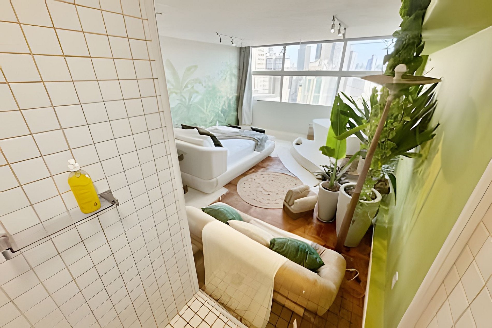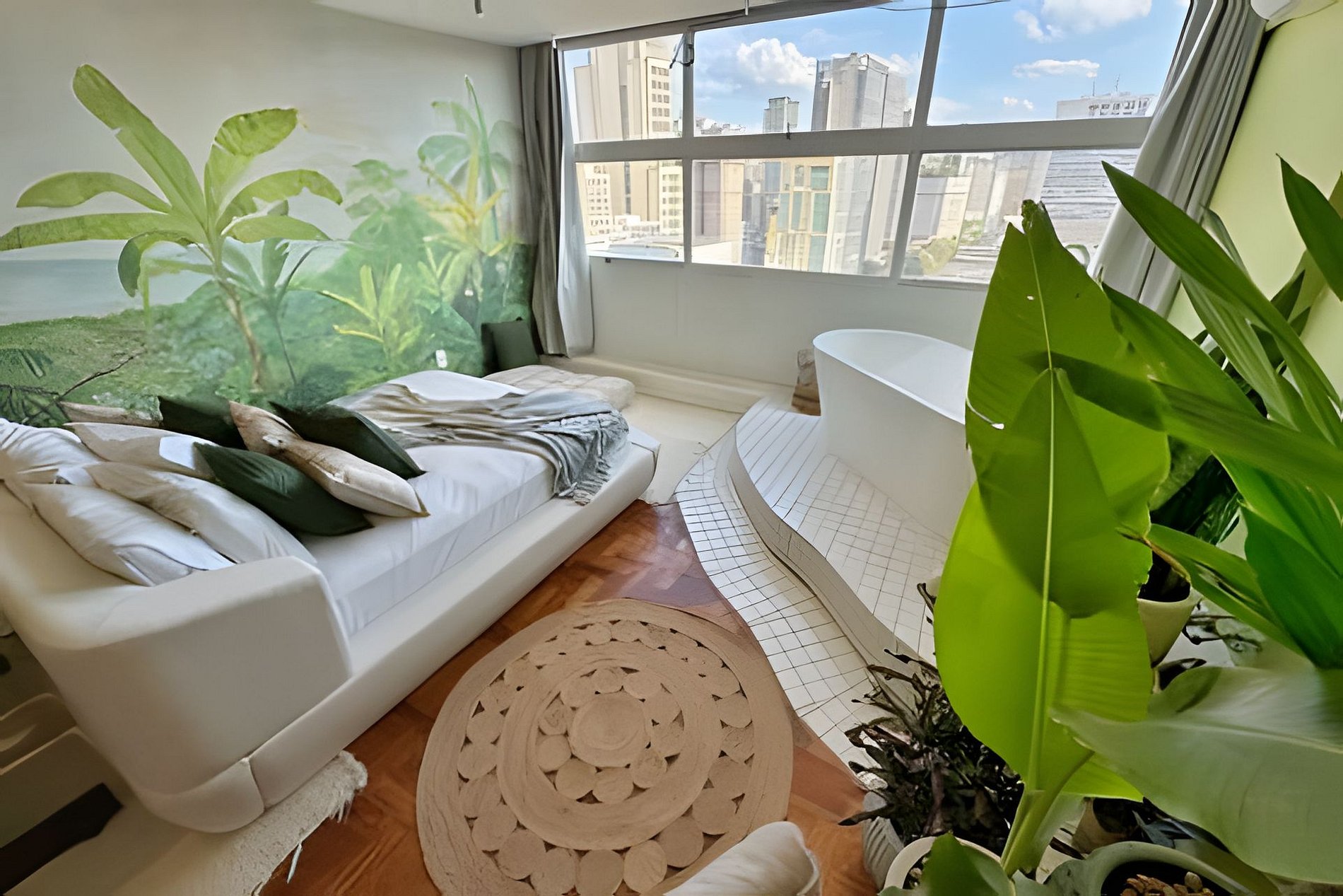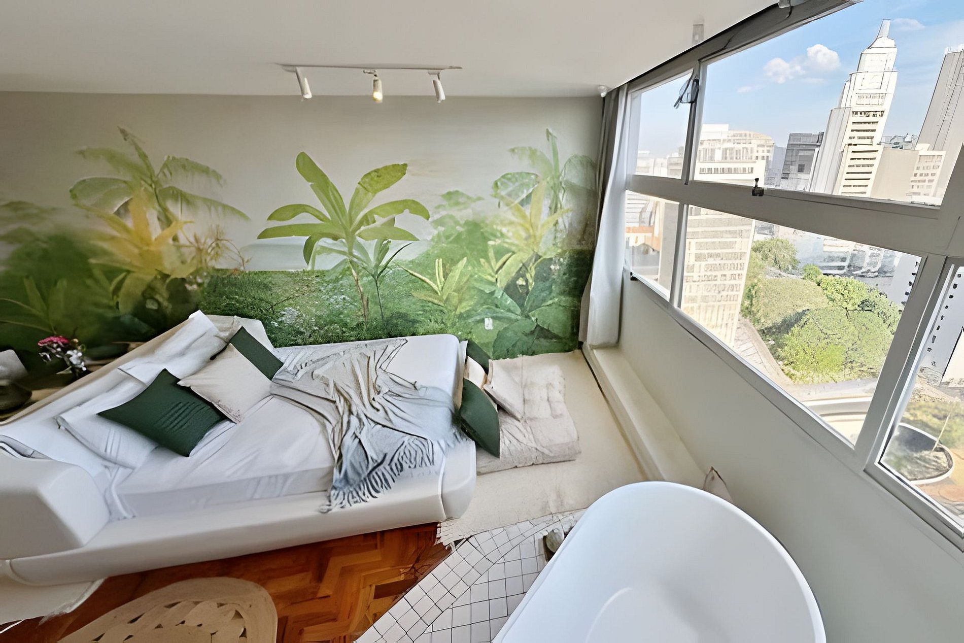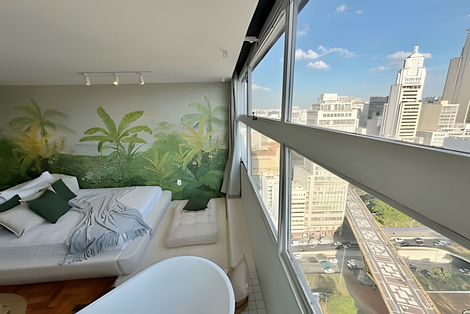 Studio charmoso com vista incrível no icônico Edifício Mirante do Vale (SAMPA SKY). Design acolhedor e cheio de personalidade, o espaço combina natureza e conforto. A banheira junto à janela, cercada por plantas e luz natural, oferece momentos únicos de relaxamento com vista para o Vale do Anhangabaú. Com ar-condicionado, cama confortável, cozinha prática e decoração caprichada, é ideal para quem busca uma experiência no centro de São Paulo. Desfrute de um cenário único no coração da cidade.