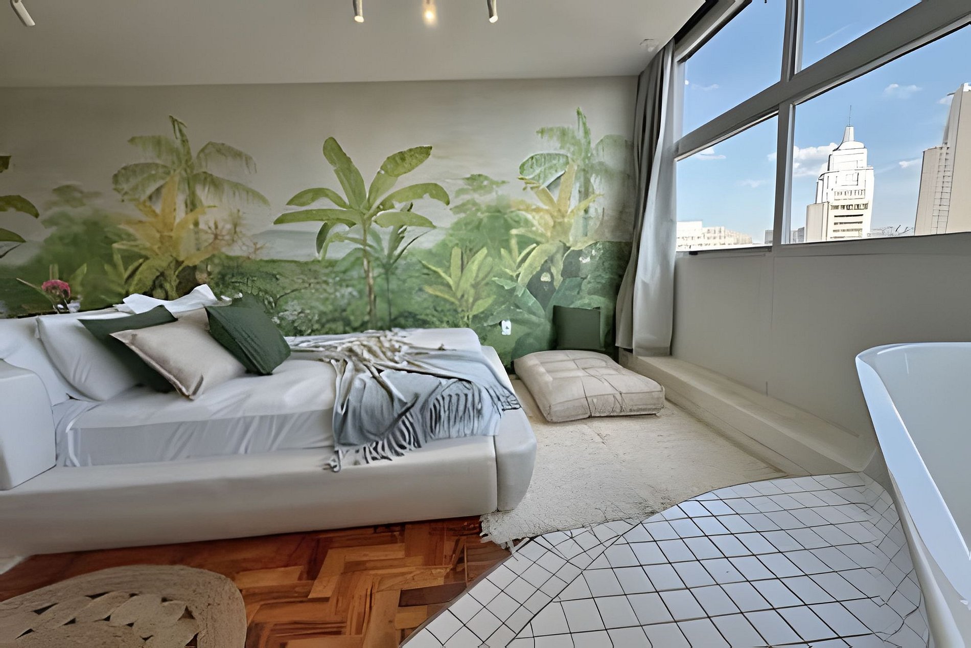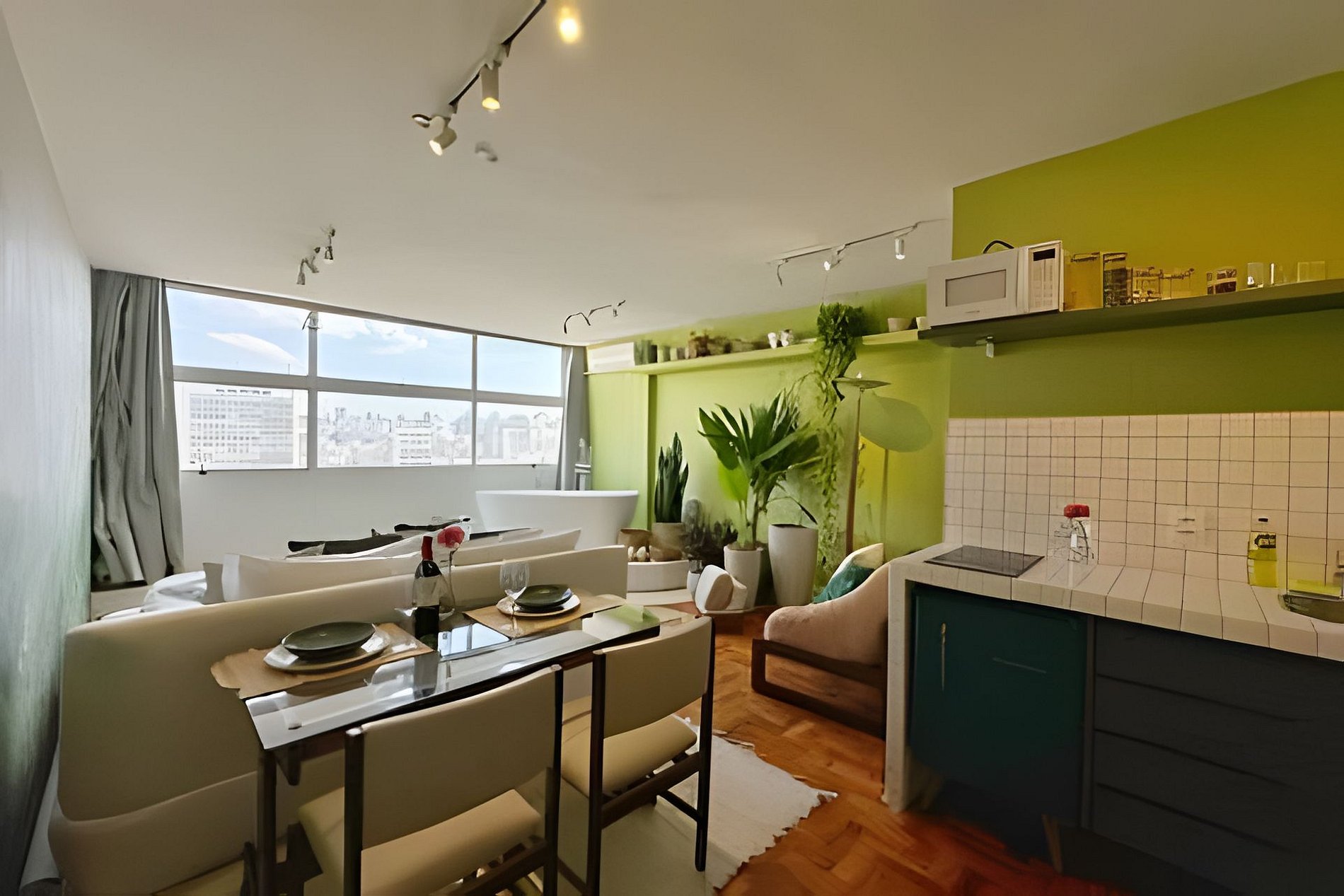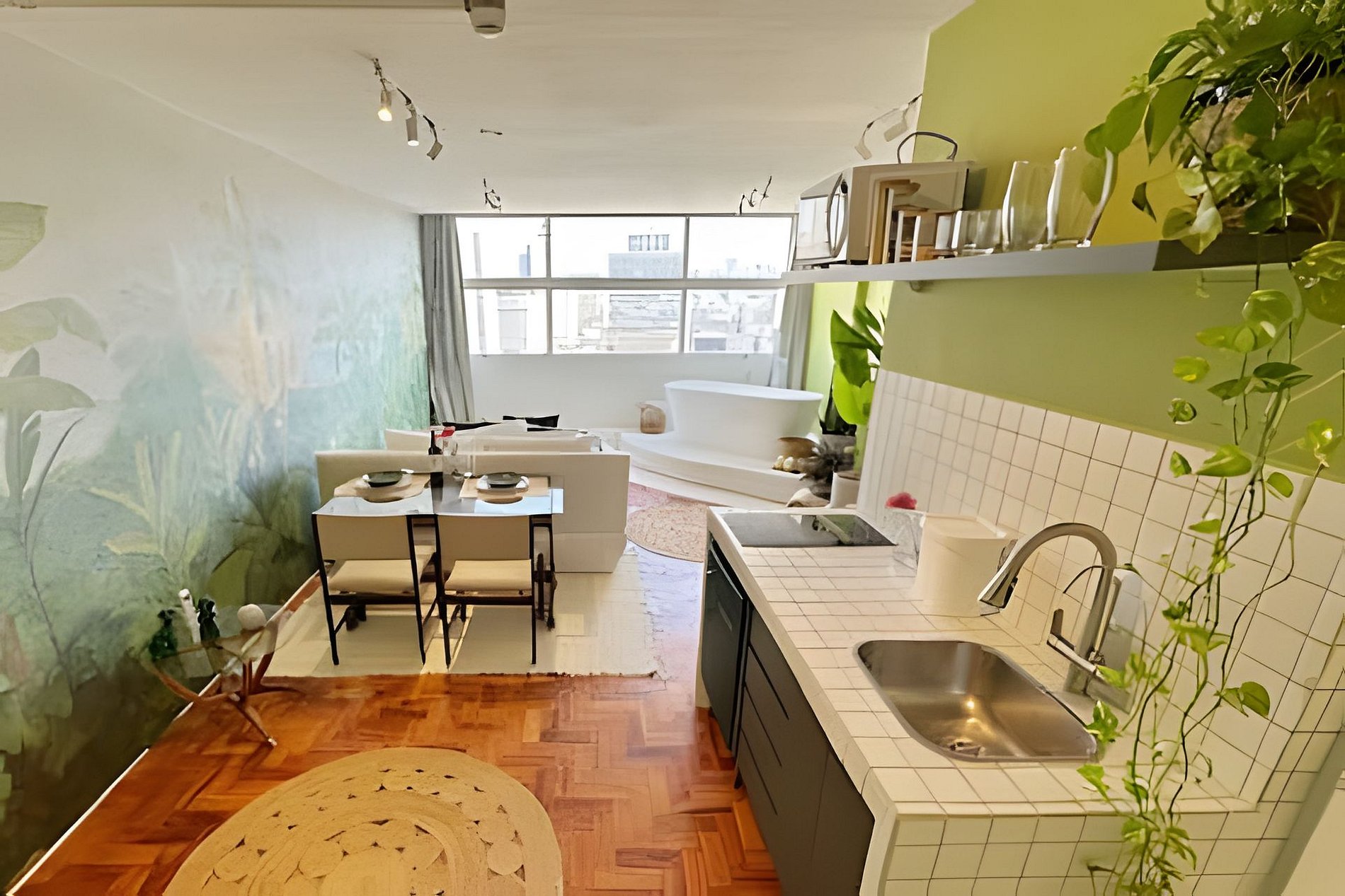 Studio charmoso com vista incrível no icônico Edifício Mirante do Vale (SAMPA SKY). Design acolhedor e cheio de personalidade, o espaço combina natureza e conforto. A banheira junto à janela, cercada por plantas e luz natural, oferece momentos únicos de relaxamento com vista para o Vale do Anhangabaú. Com ar-condicionado, cama confortável, cozinha prática e decoração caprichada, é ideal para quem busca uma experiência no centro de São Paulo. Desfrute de um cenário único no coração da cidade.