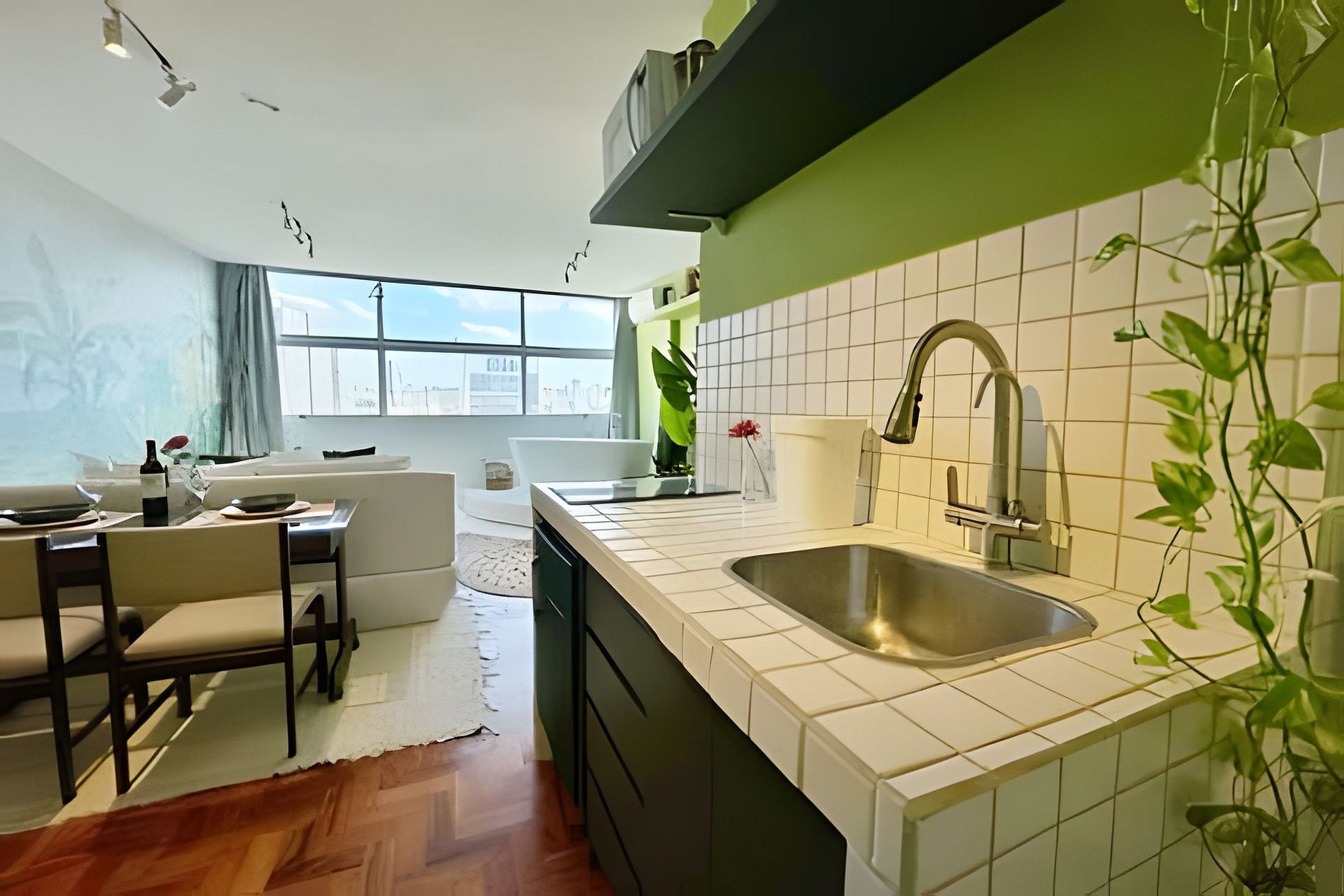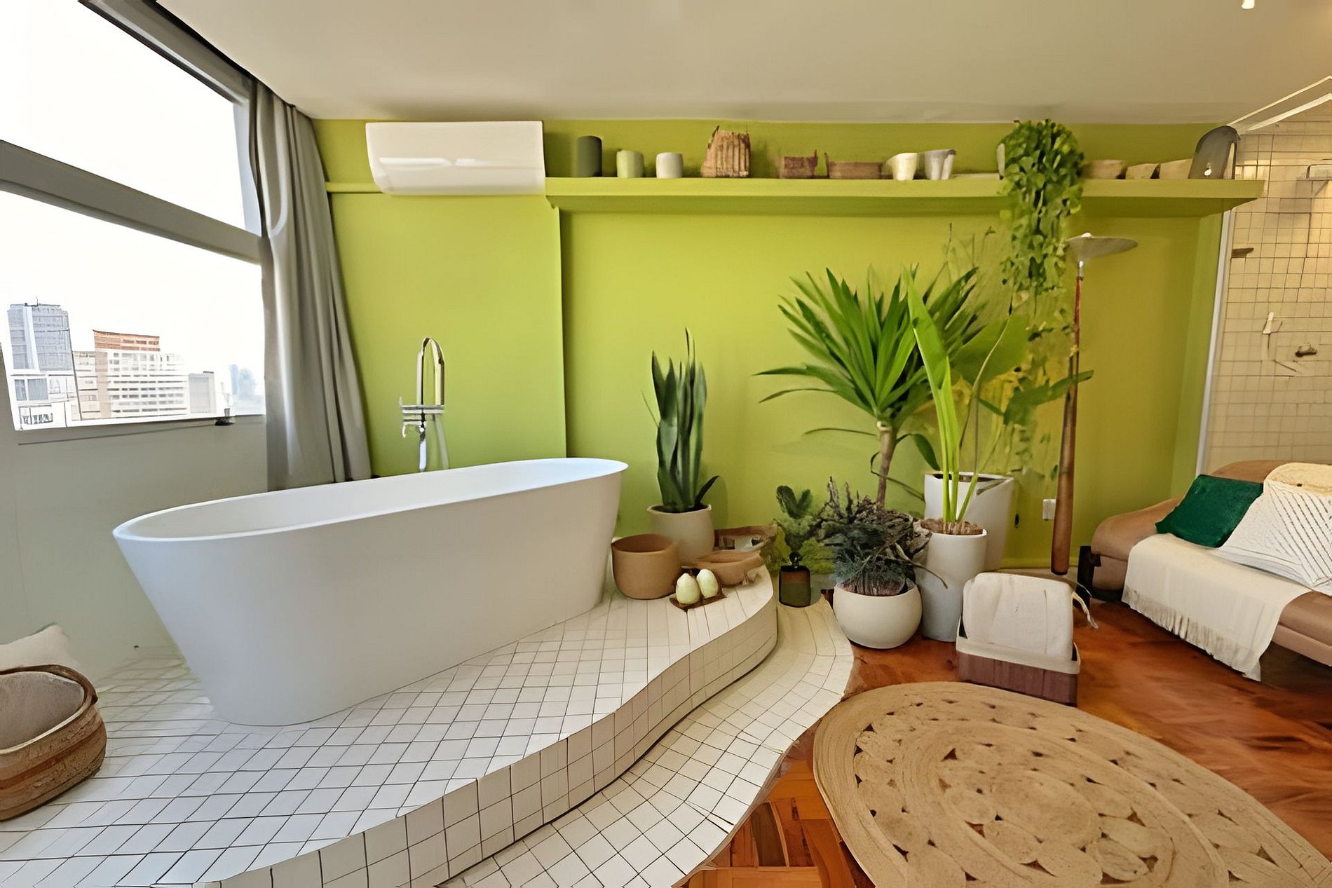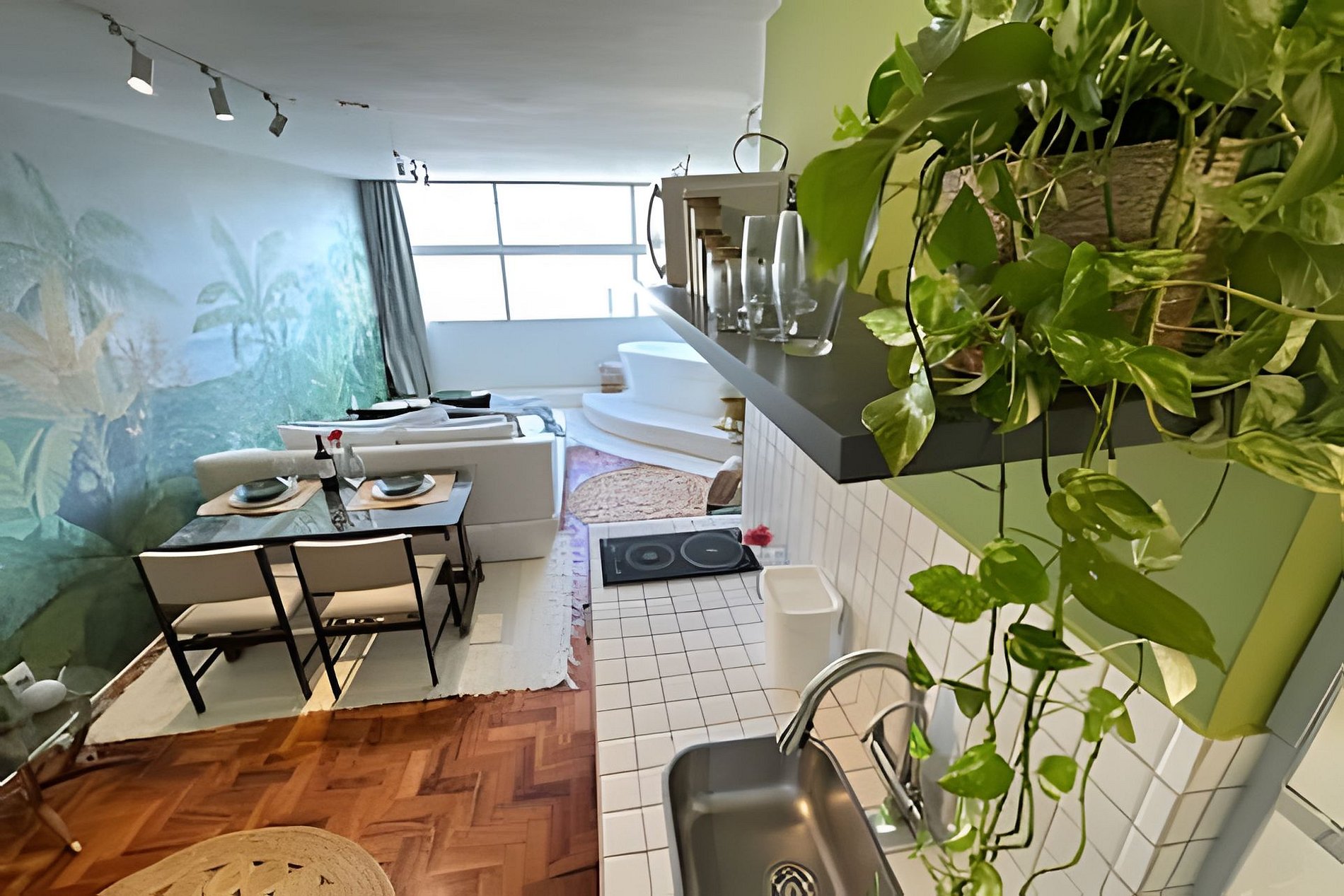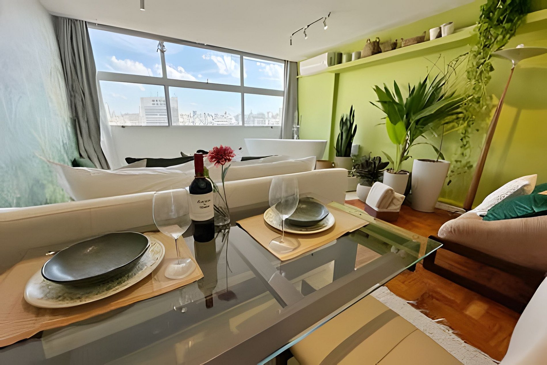 Studio charmoso com vista incrível no icônico Edifício Mirante do Vale (SAMPA SKY). Design acolhedor e cheio de personalidade, o espaço combina natureza e conforto. A banheira junto à janela, cercada por plantas e luz natural, oferece momentos únicos de relaxamento com vista para o Vale do Anhangabaú. Com ar-condicionado, cama confortável, cozinha prática e decoração caprichada, é ideal para quem busca uma experiência no centro de São Paulo. Desfrute de um cenário único no coração da cidade.