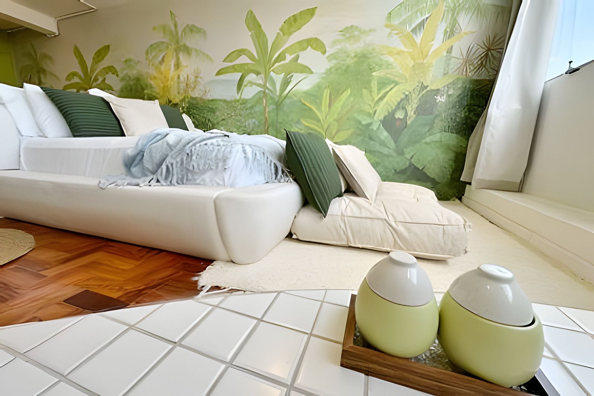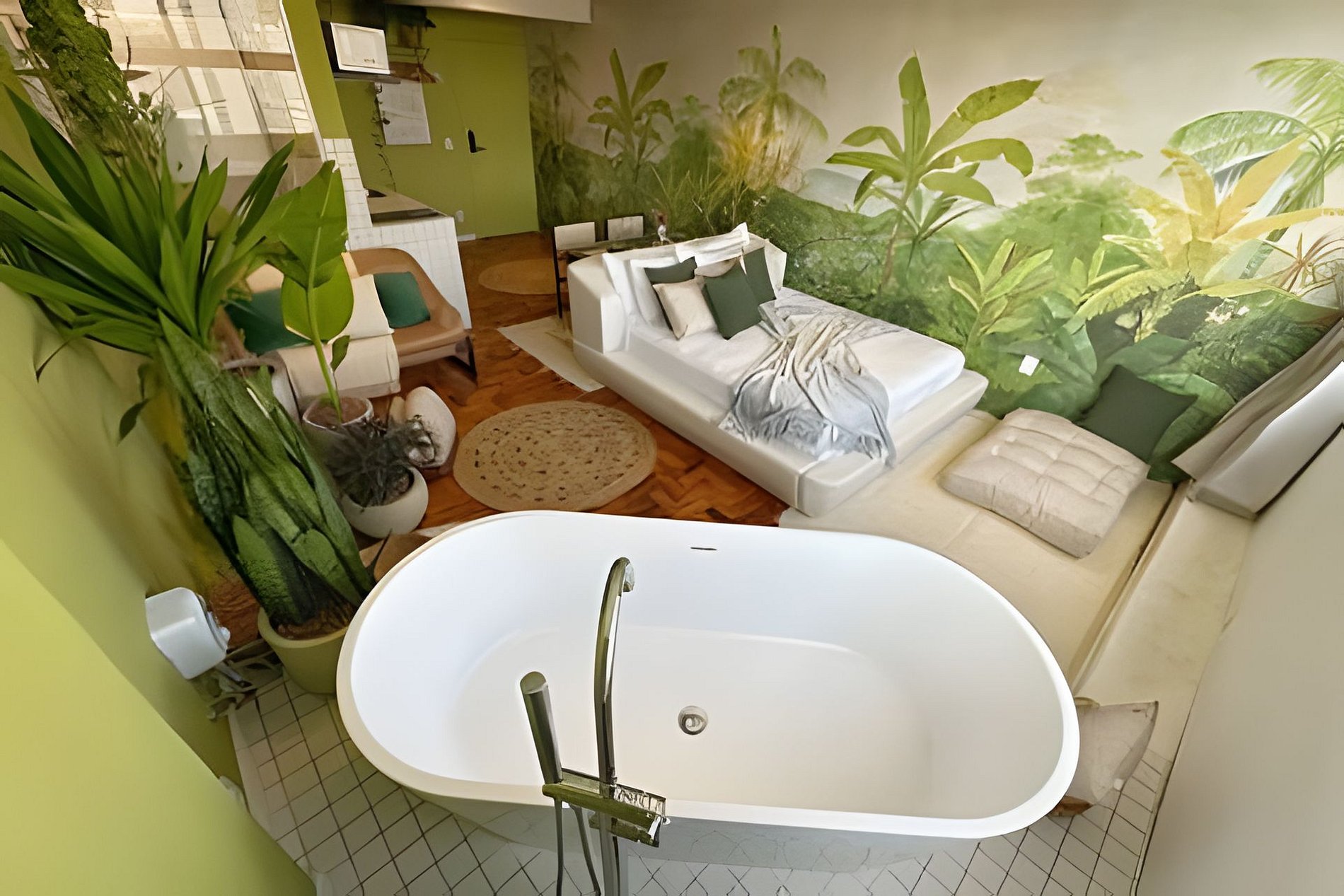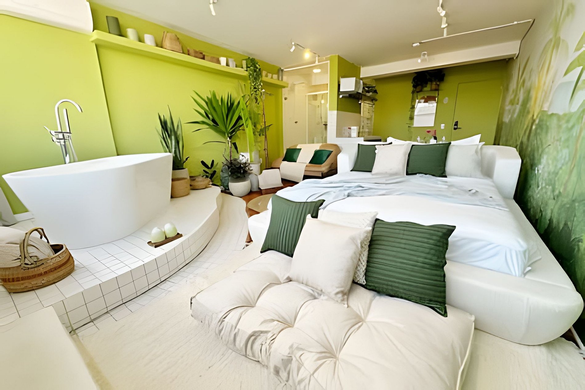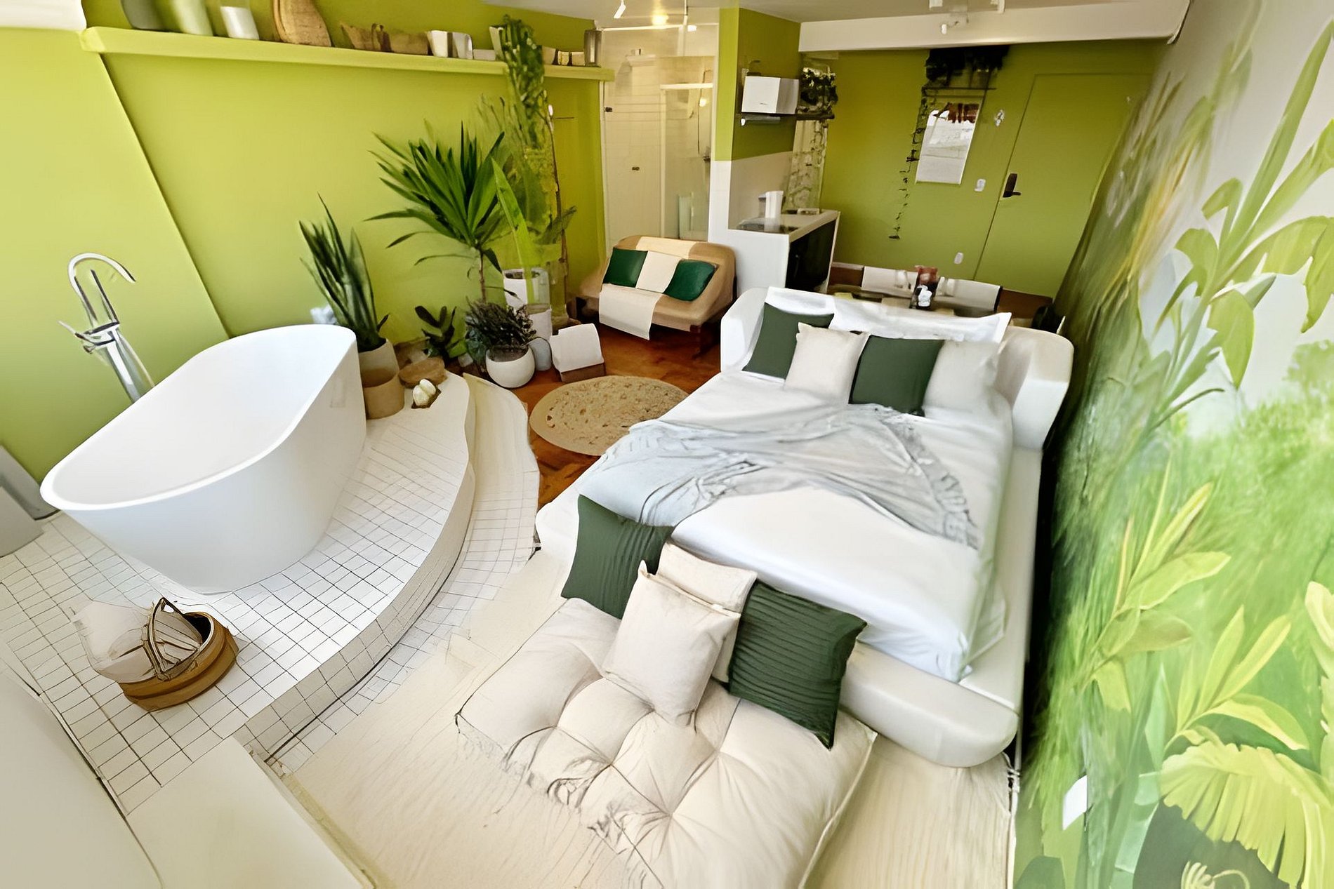 Studio espaçoso, design contemporâneo, Wi‑Fi rápido, cooktop, frigobar e aquela banheira charmosa para coroar sua experiência. Tudo pensado para você se sentir em casa com um toque de luxo