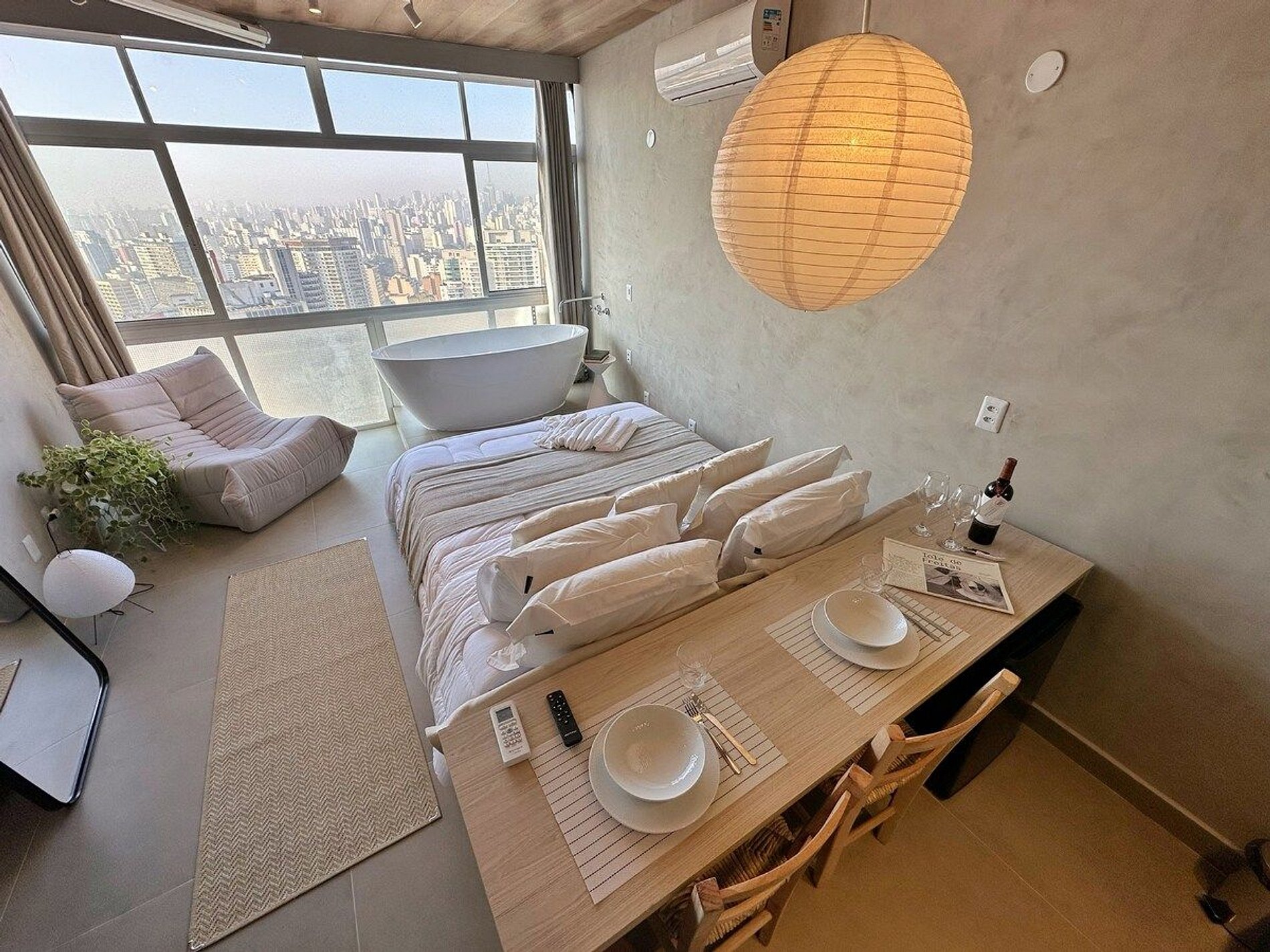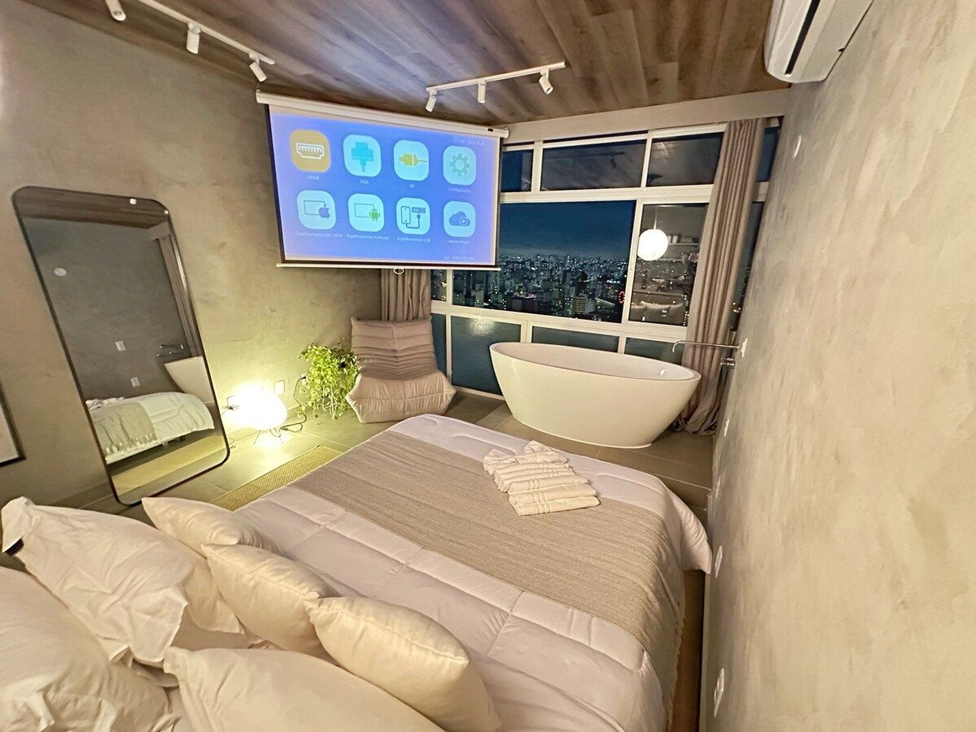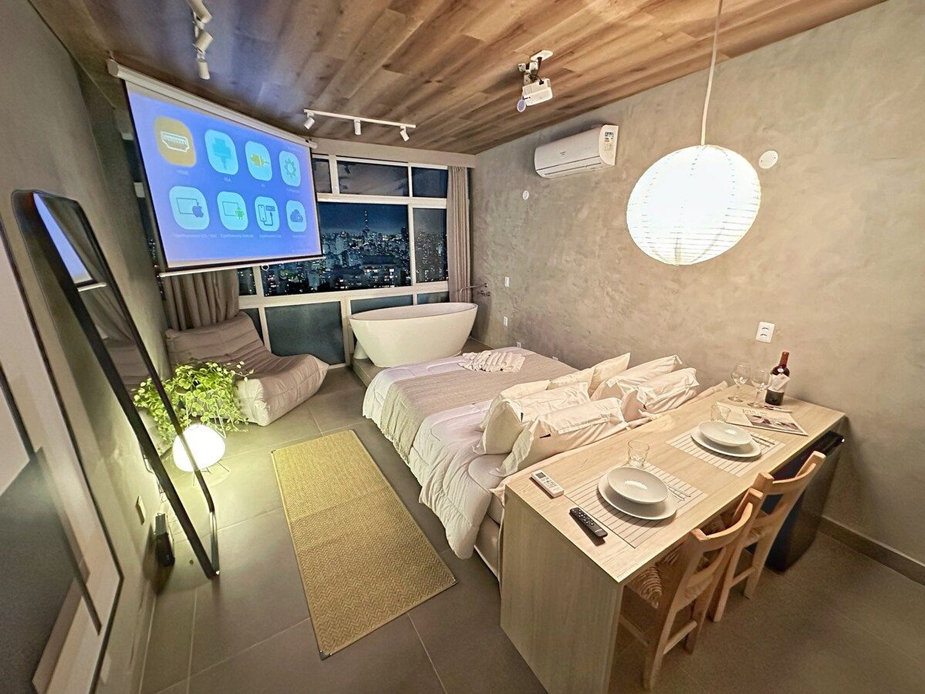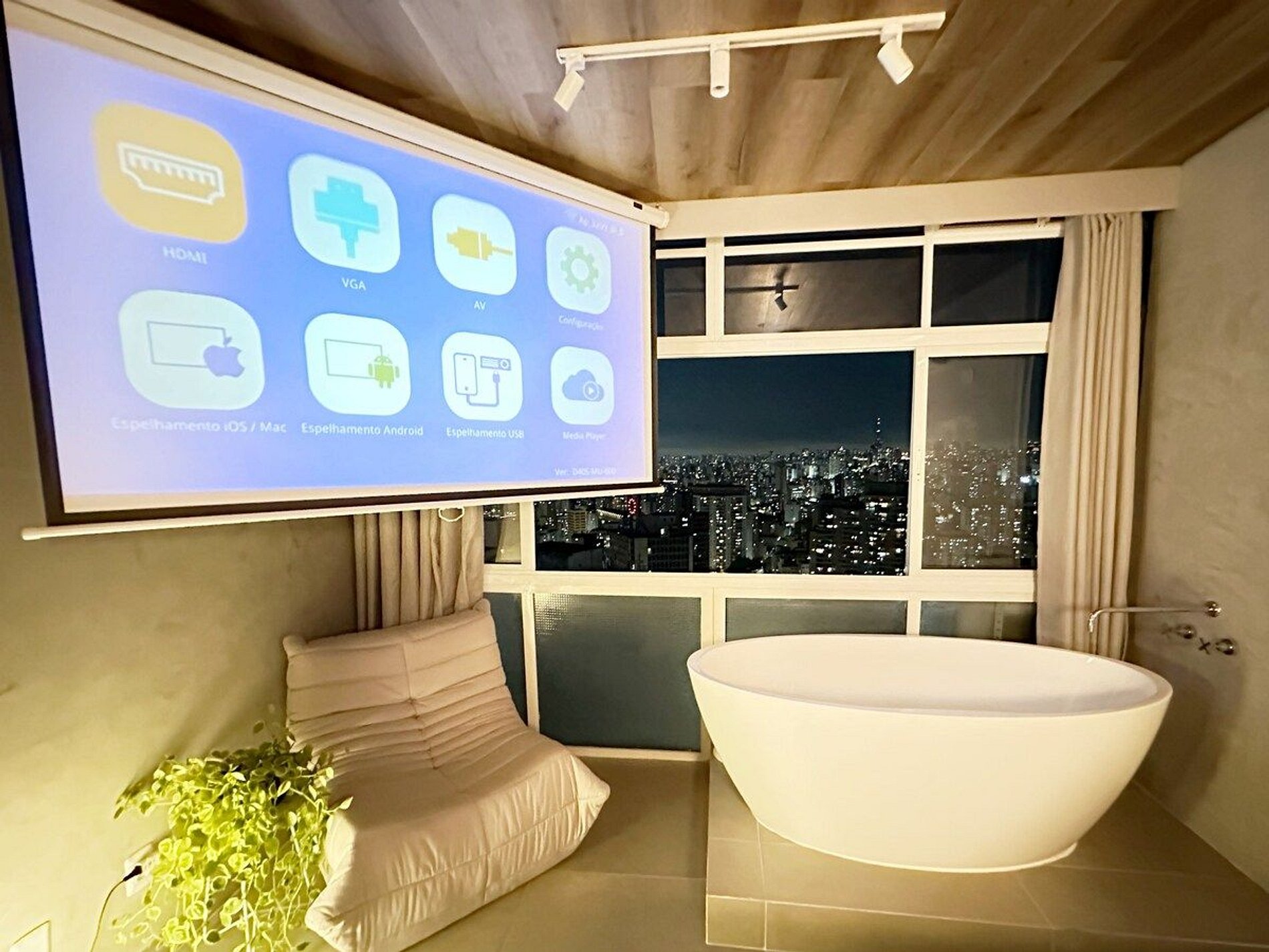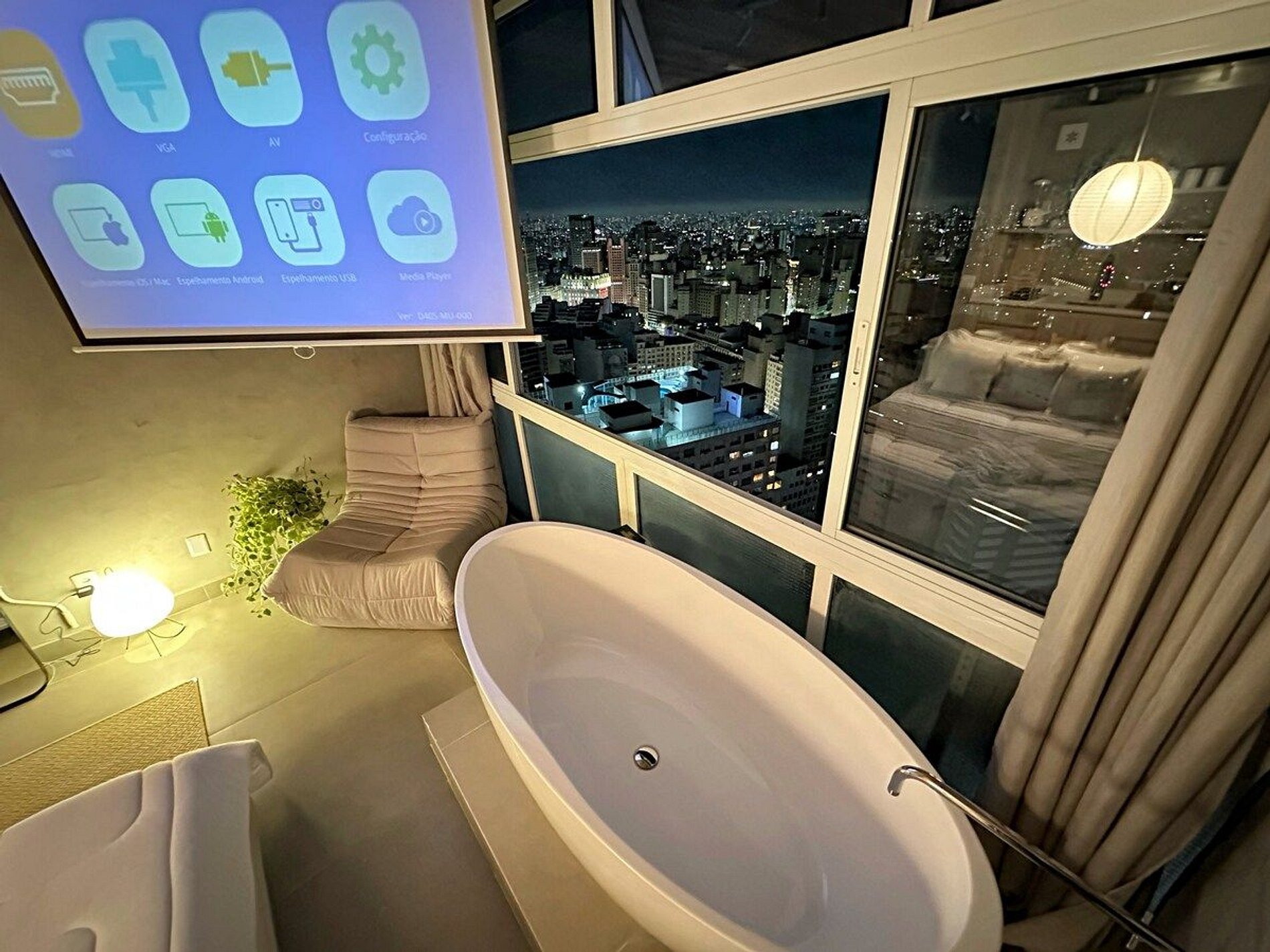 Imagine-se no último andar do edifício mais famoso do Brasil, observando a cidade do alto dentro de uma banheira de imersão. Esta é a experiência que queremos proporcionar a você. E se isso for feito também com um telão de 100" com seus filmes e clipes favoritos? Apartamento confortável com ar condicionado, cozinha completa e um banheiro super espaçoso, além de um guarda roupa para estadias mais longas.