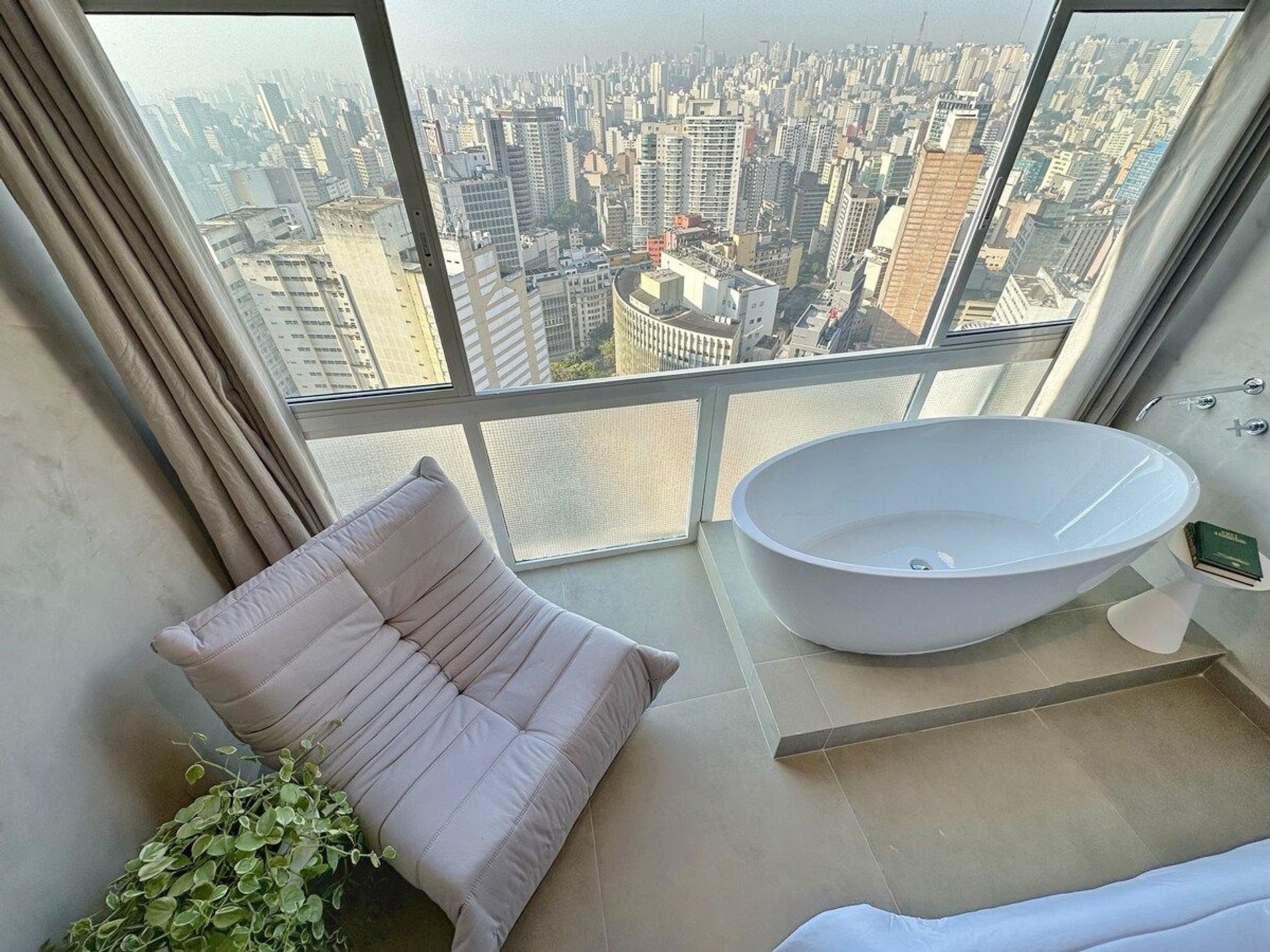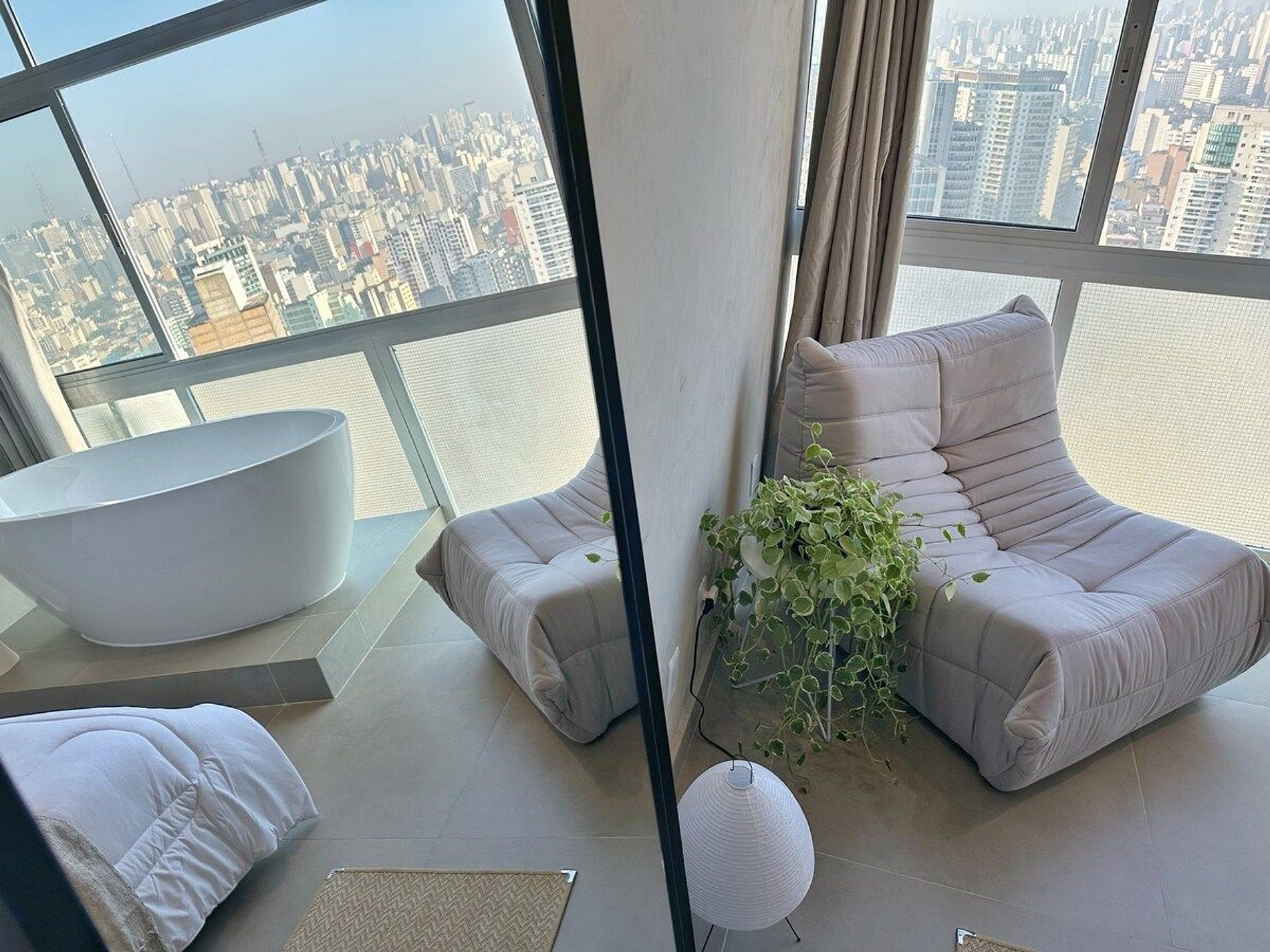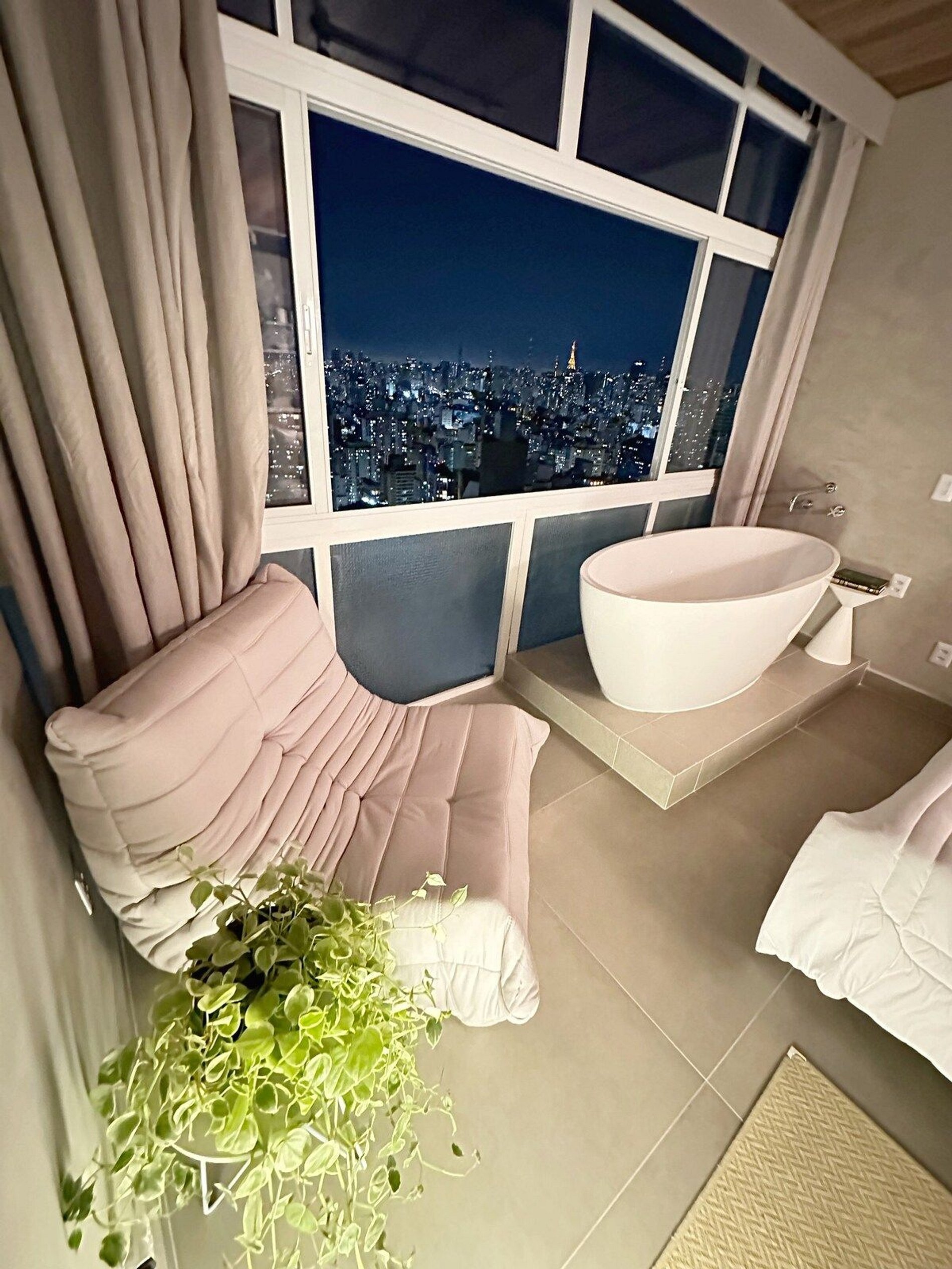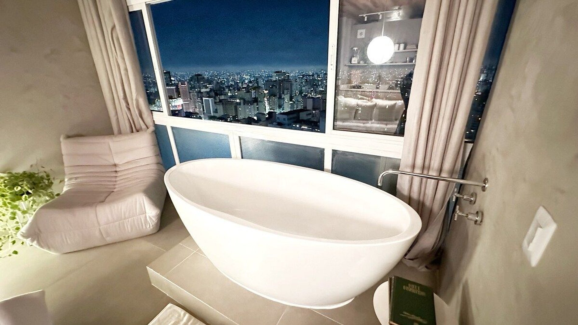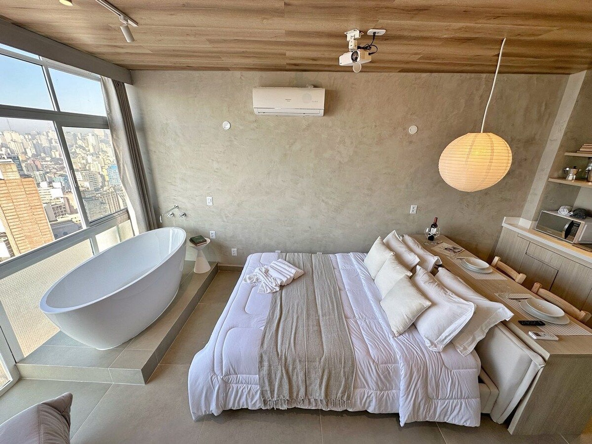 Imagine-se no último andar do edifício mais famoso do Brasil, observando a cidade do alto dentro de uma banheira de imersão. Esta é a experiência que queremos proporcionar a você. E se isso for feito também com um telão de 100" com seus filmes e clipes favoritos? Apartamento confortável com ar condicionado, cozinha completa e um banheiro super espaçoso, além de um guarda roupa para estadias mais longas.