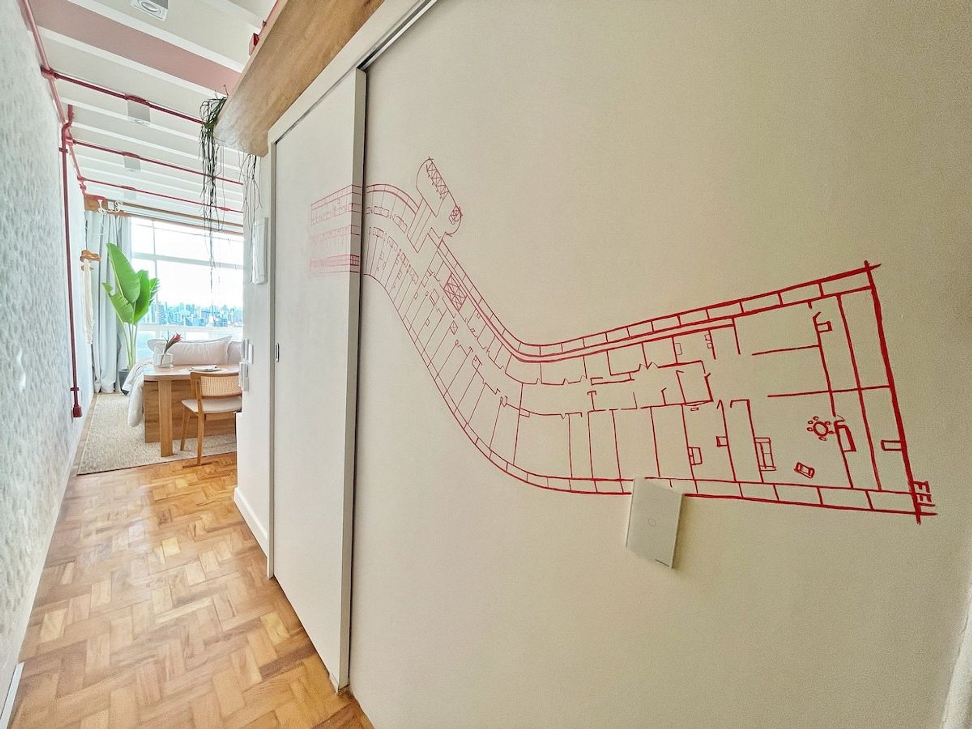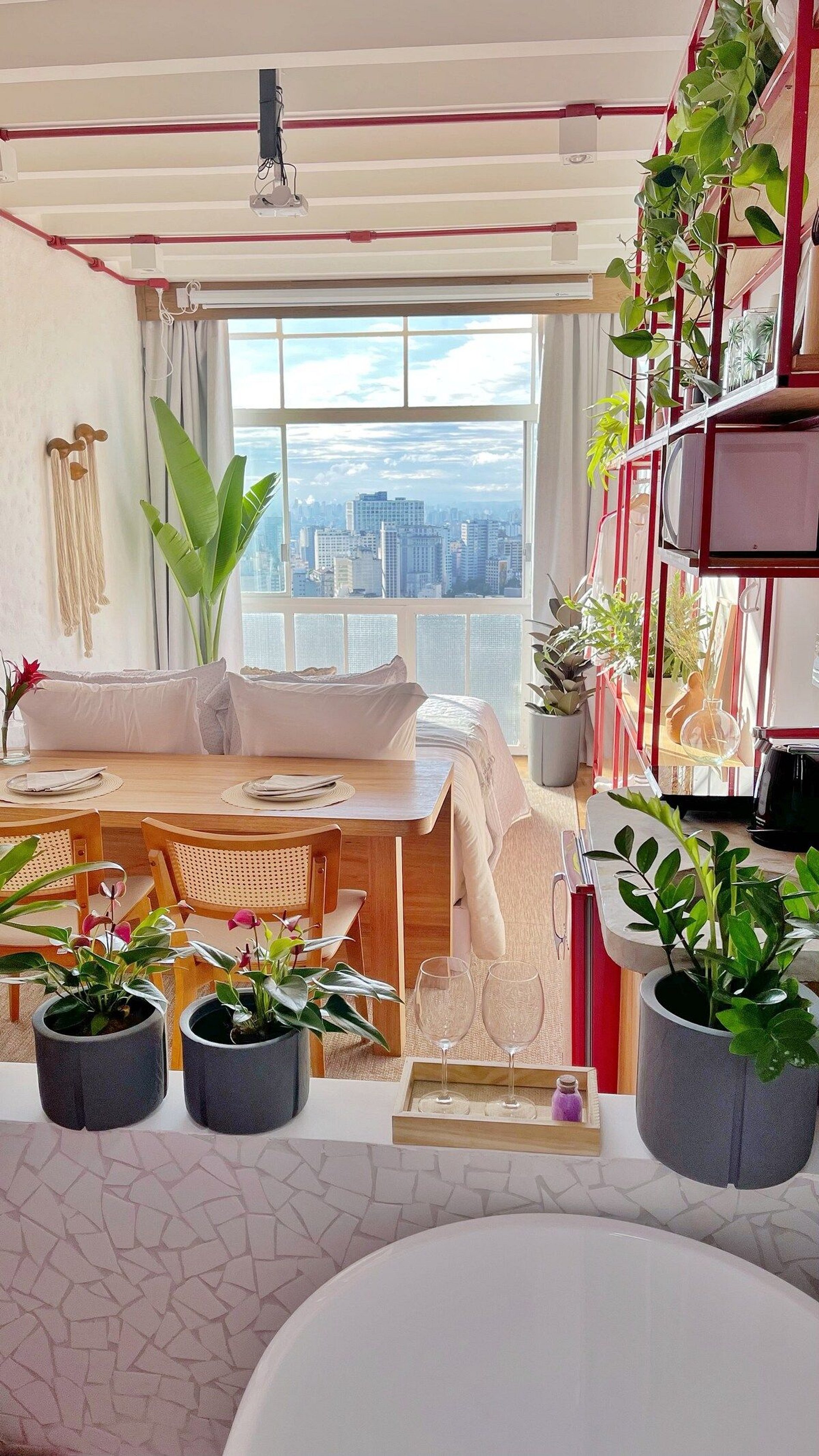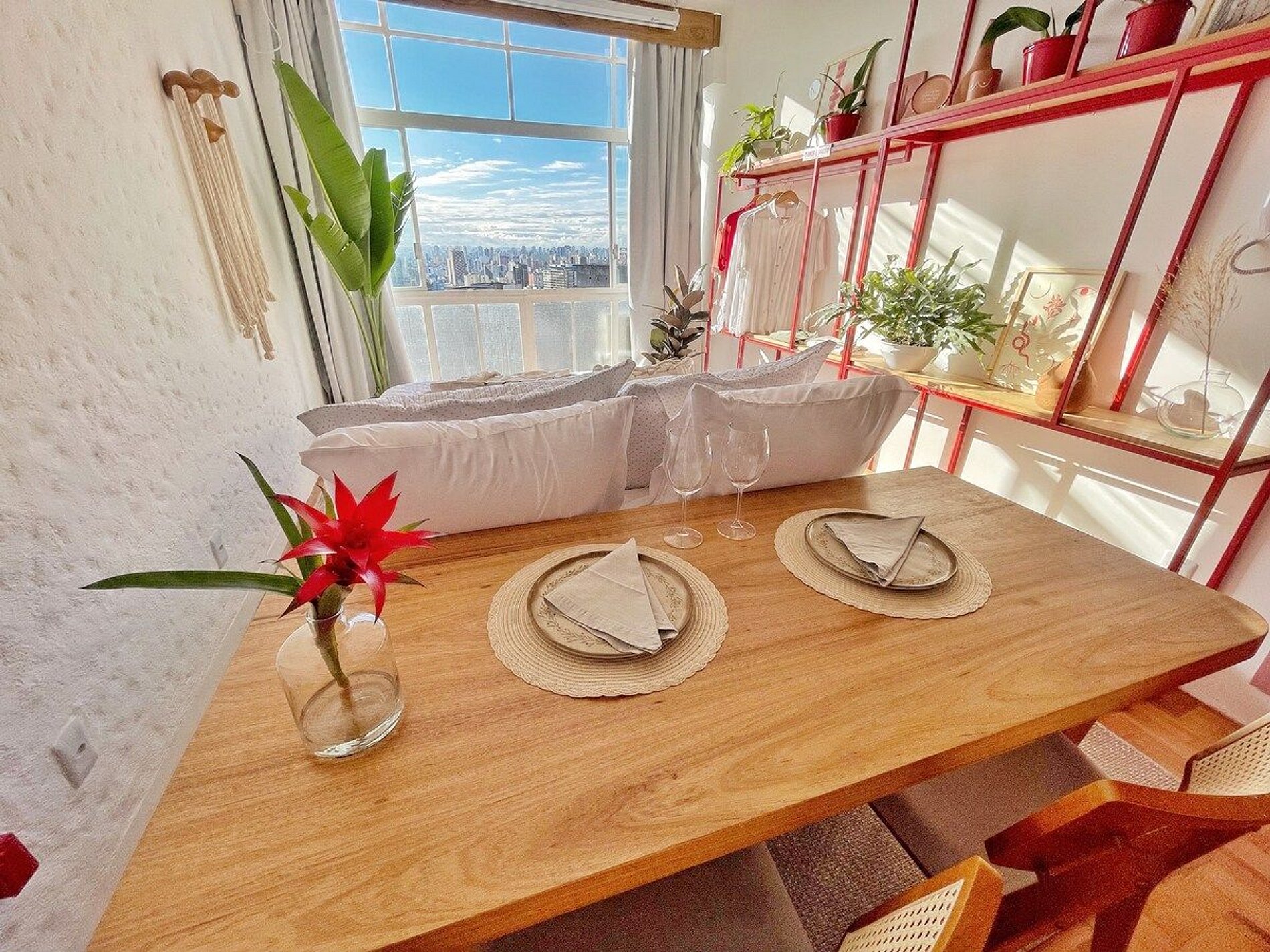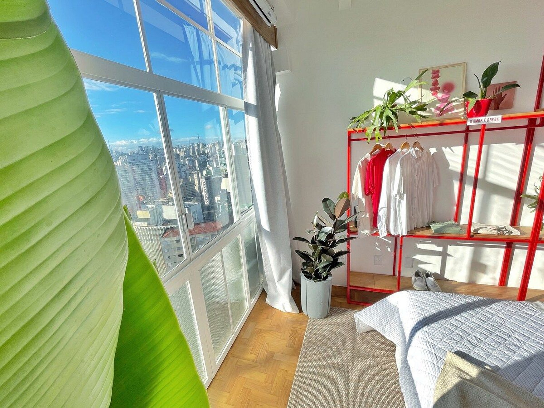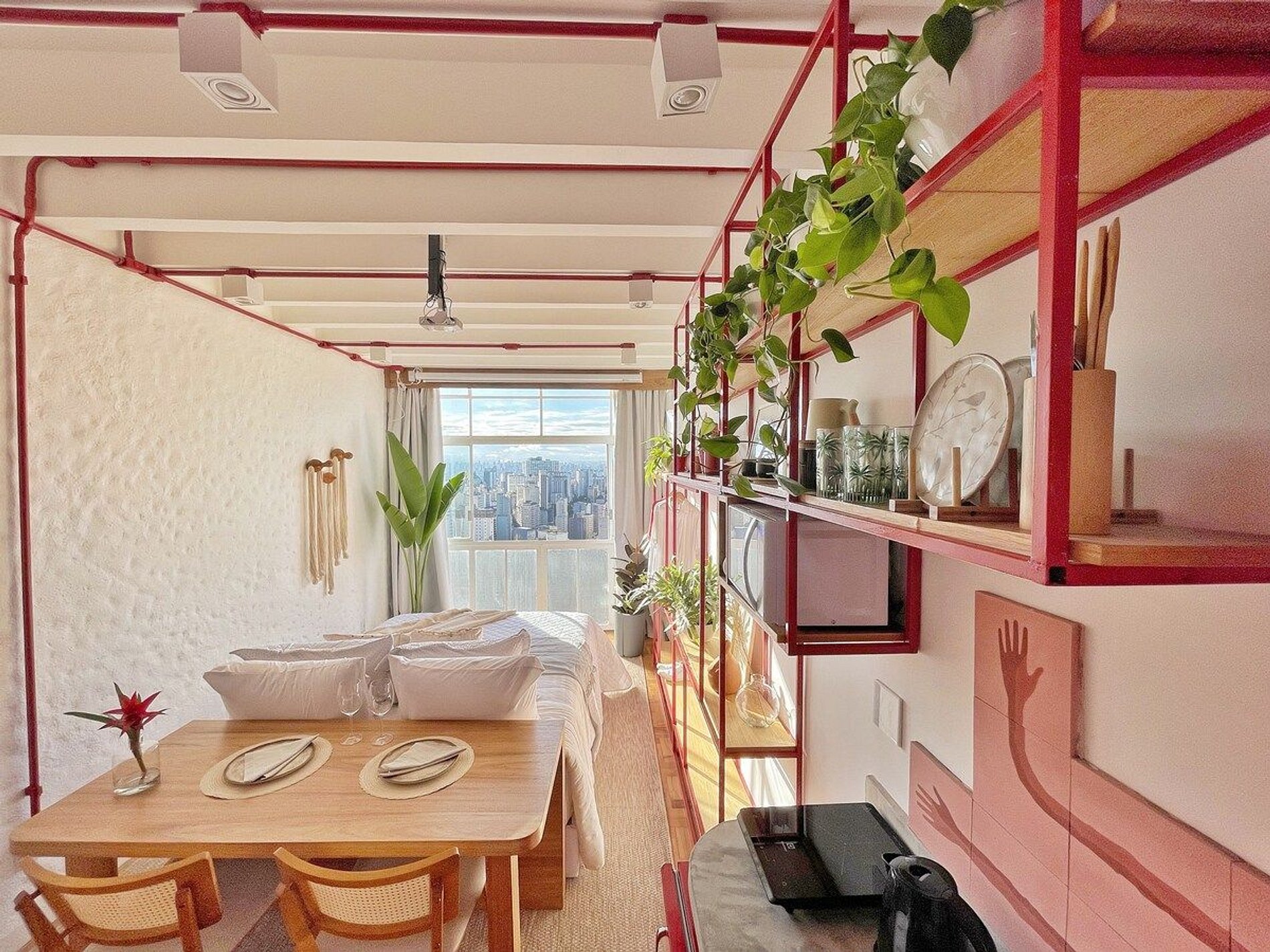 Desenhado por @yanaina_interiores Este Studio no prédio mais famoso do Brasil faz parte do projeto @airbnbnocopan e foi desenhado de acordo com as sugestões e pedidos de nossos hóspedes e seguidores em pesquisas feitas nas redes sociais. Um design diferente que valoriza a vista do apartamento no 27º andar, com um de 100 polegadas e jacuzzi. É possível assistir seus filmes da cama, da mesa de jantar ou do banho. O espaço conta ainda com ar condicionado e internet (fibra) de alta velocidade.