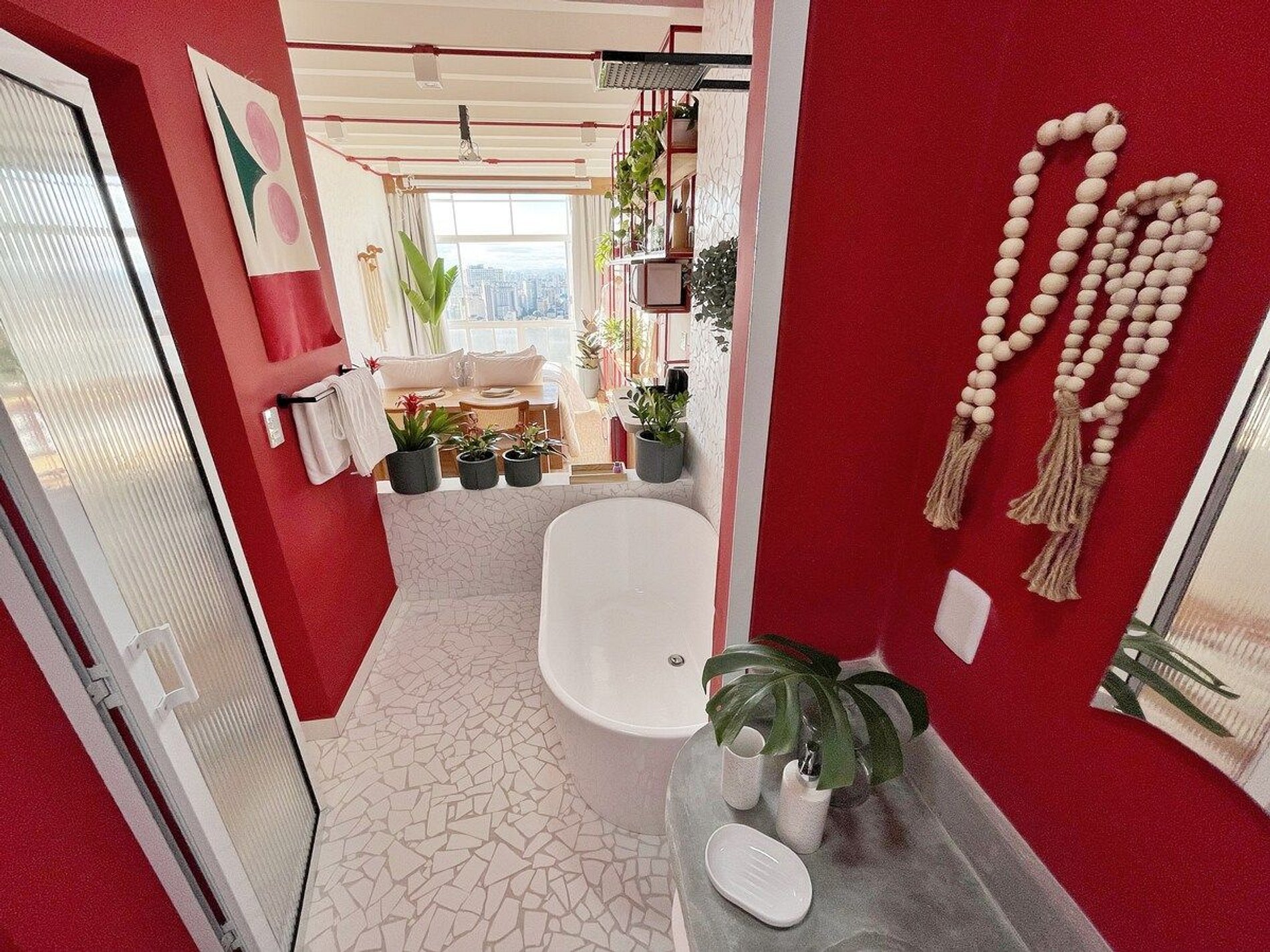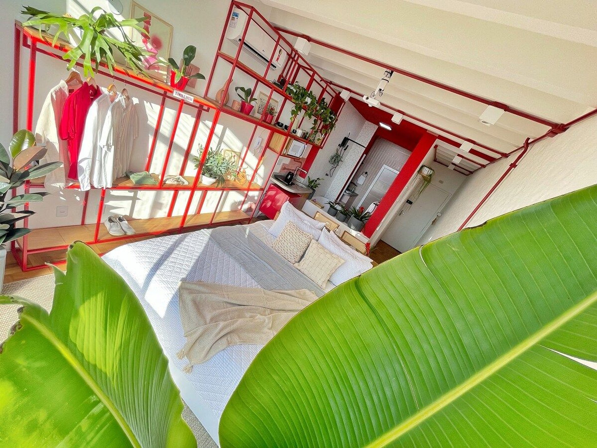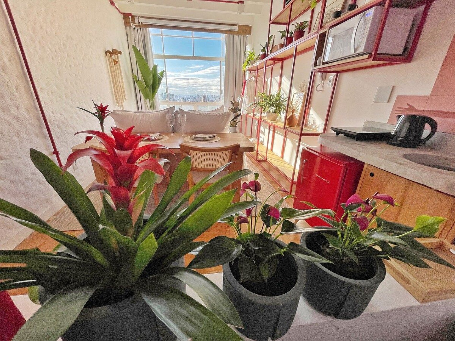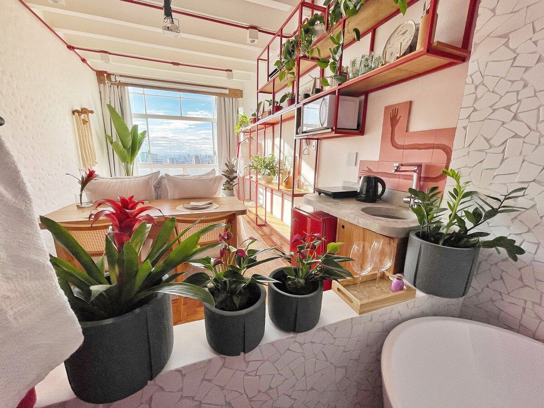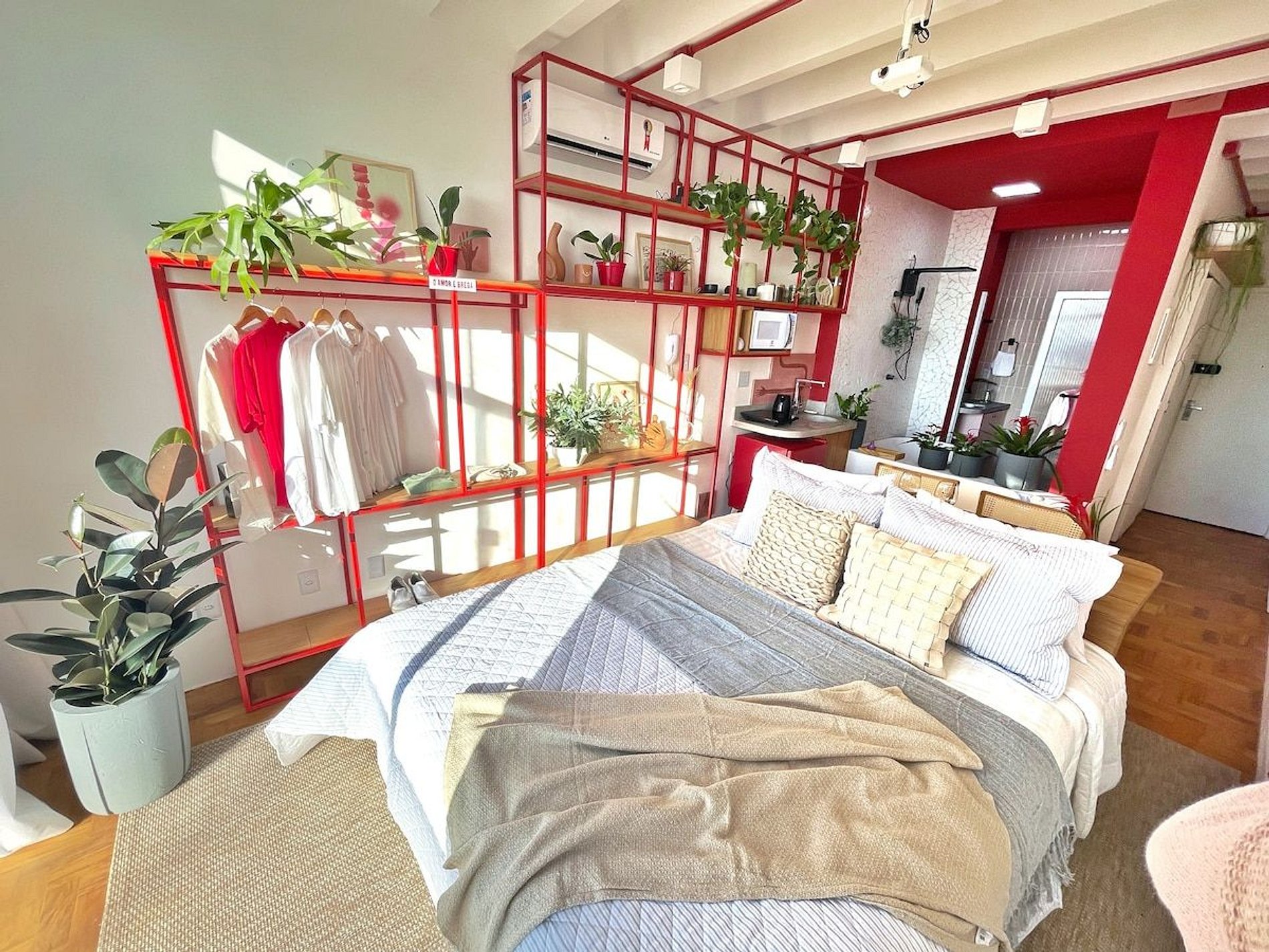 Desenhado por @yanaina_interiores Este Studio no prédio mais famoso do Brasil faz parte do projeto @airbnbnocopan e foi desenhado de acordo com as sugestões e pedidos de nossos hóspedes e seguidores em pesquisas feitas nas redes sociais. Um design diferente que valoriza a vista do apartamento no 27º andar, com um de 100 polegadas e jacuzzi. É possível assistir seus filmes da cama, da mesa de jantar ou do banho. O espaço conta ainda com ar condicionado e internet (fibra) de alta velocidade.