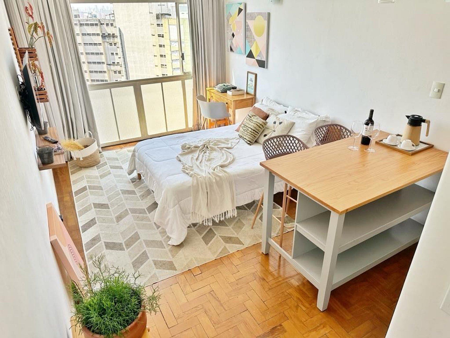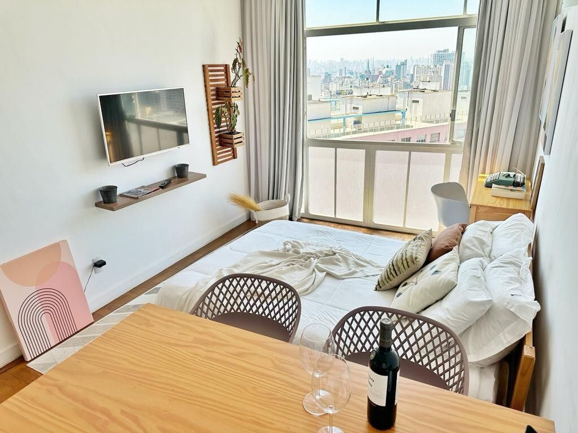 Studio confortável e bem localizado no prédio mais famoso de São Paulo. Totalmente reformado, com boa iluminação, agradável para estadias curtas e longas. Decoração alegre e funcional, com vista sensacional da cidade. Próximo ao metrô e a corredores de ônibus, propicia fácil acesso aos principais pontos de São Paulo. Desenhado por Oscar Niemeyer, o edifício tem ótima localização, além de inúmeros serviços dentro do próprio prédio (padaria, restaurantes, cafés, salões de beleza e lojas).