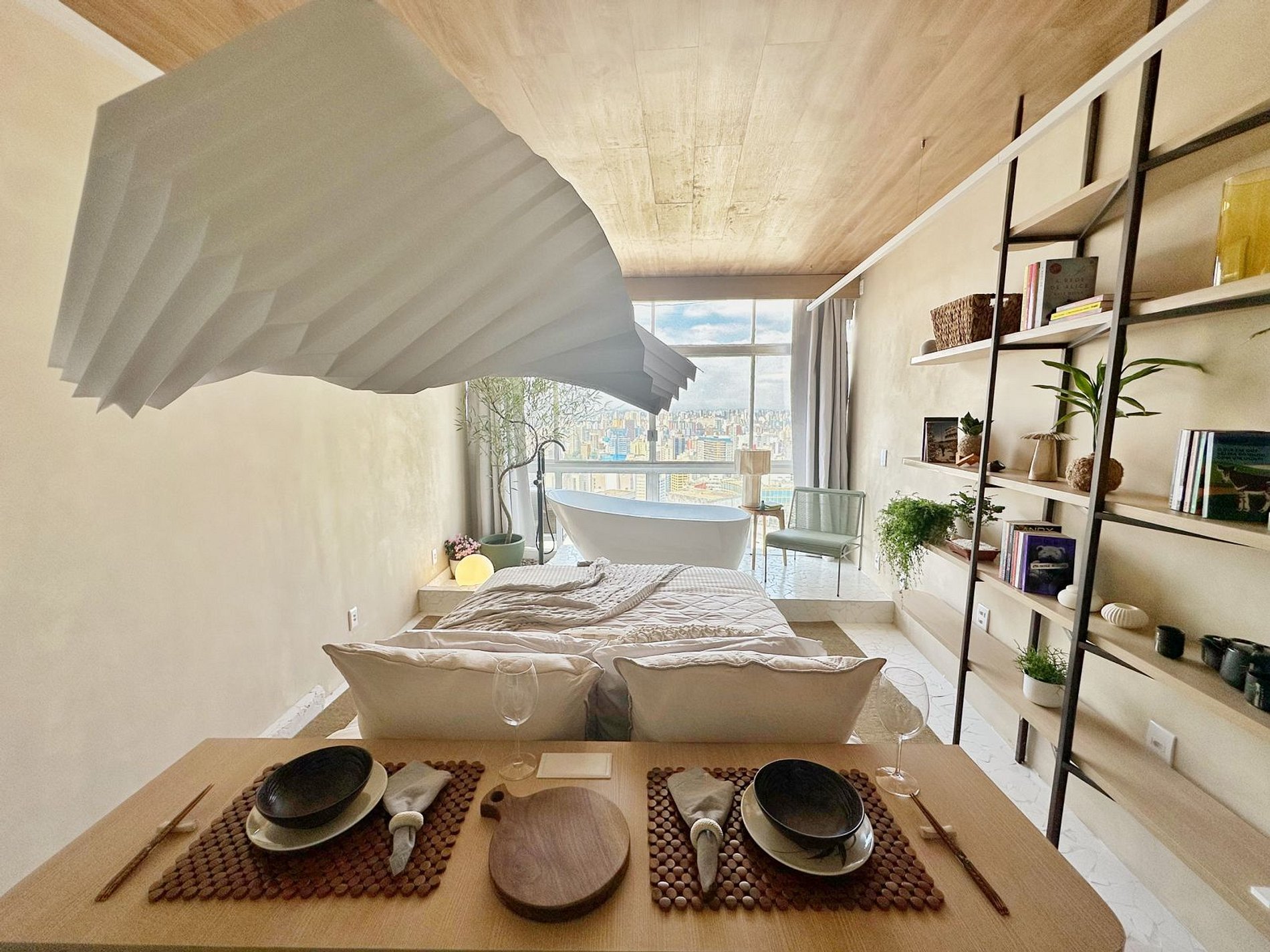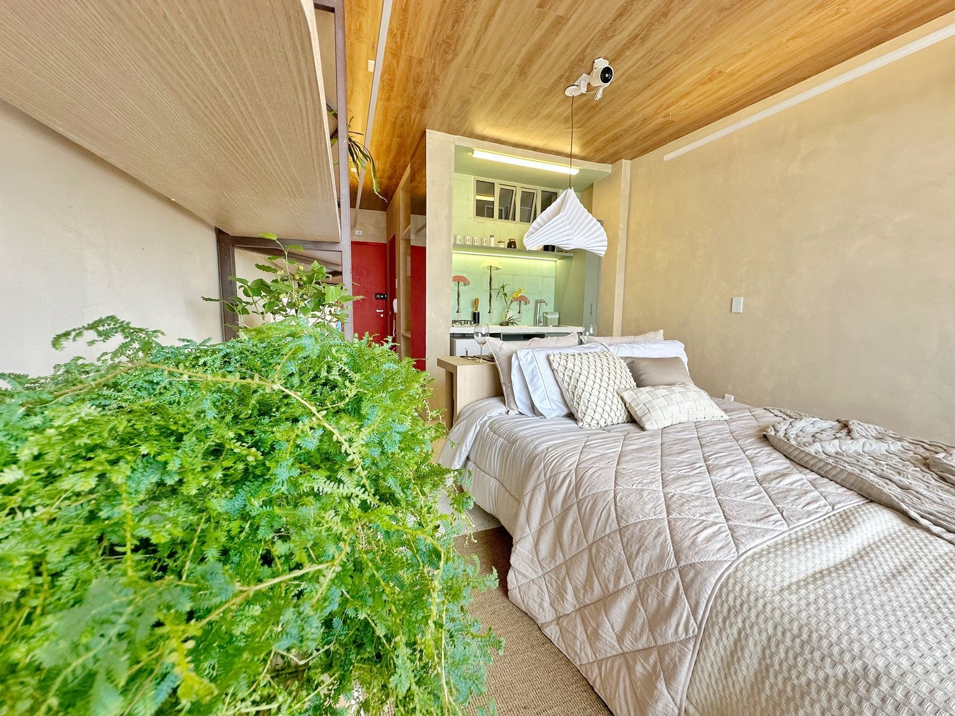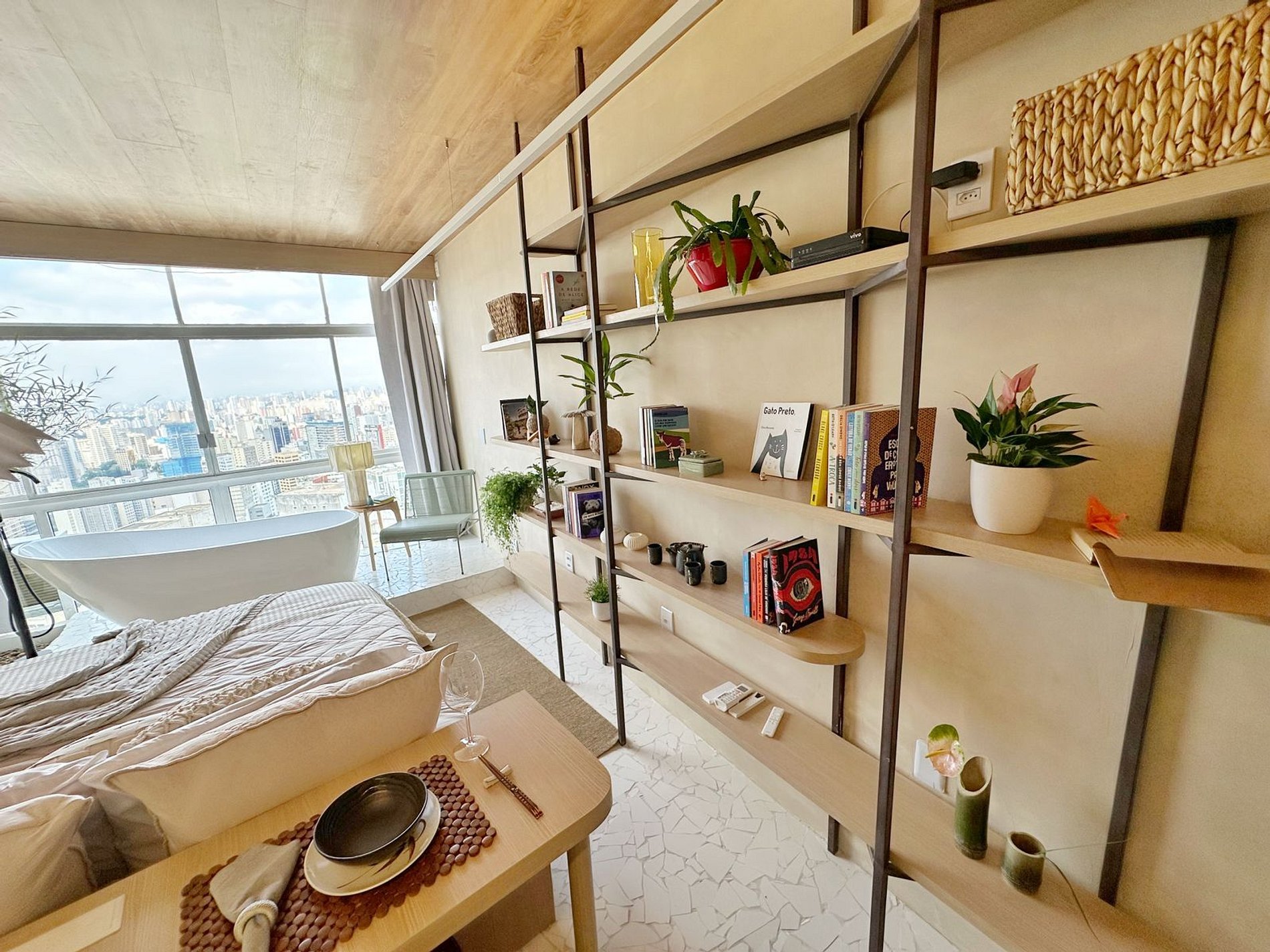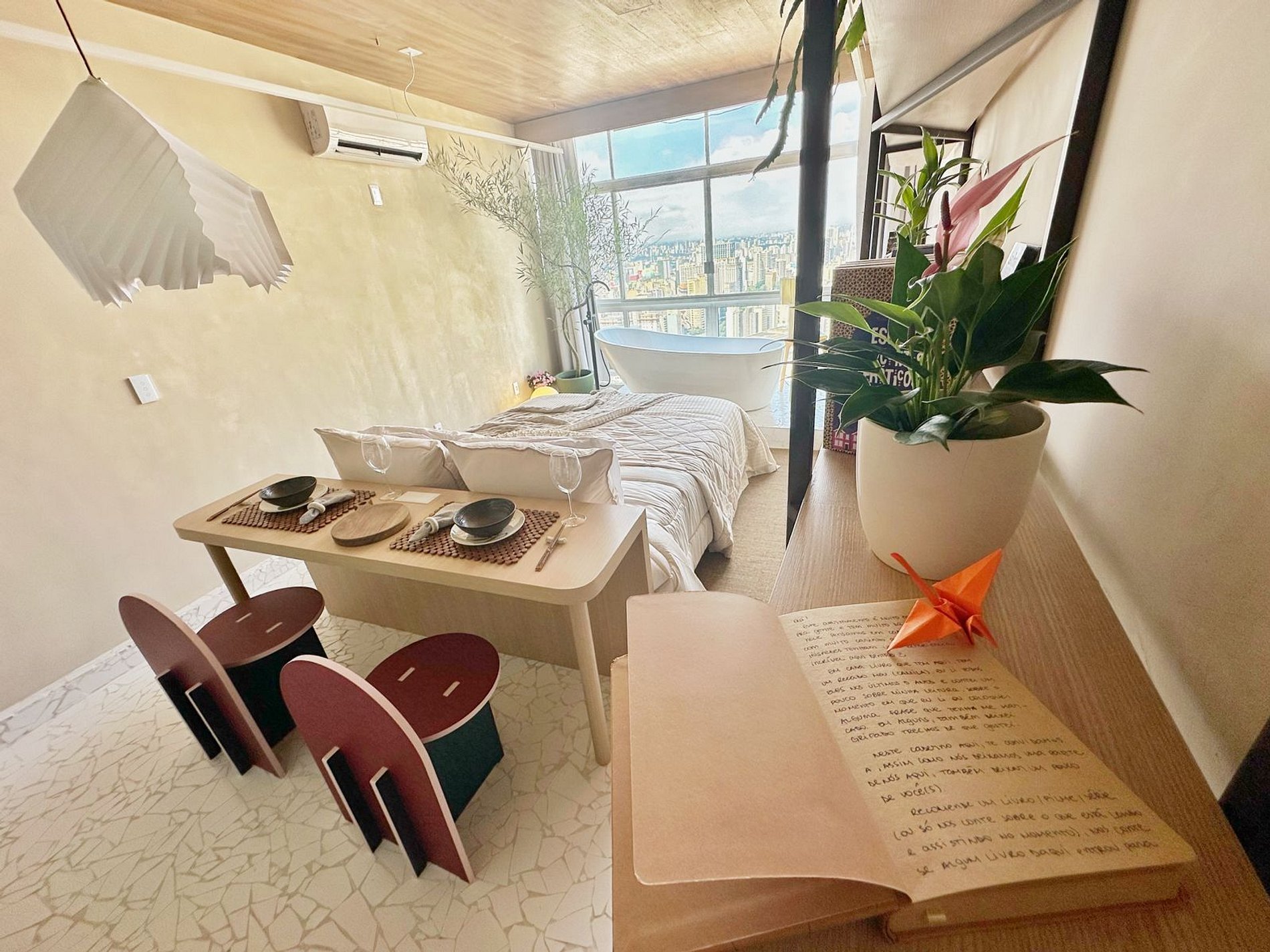 Por @yanainainteriores Este studio foi totalmente reformado em fevereiro de 2024. Trabalhamos para criar histórias de hospedagem. E a história desse Ape é sobre descansar. Um Studio projetado para hospedar livros e pessoas. A Proprietária, uma apaixonada por livros, deixou nele cerca de 50 obras que leu nos últimos 5 anos, todas com uma dedicatória especial que apresenta o livro aos hóspedes, além de alguns importantes trechos marcados. Telão de 100”, banheira e ar condicionado