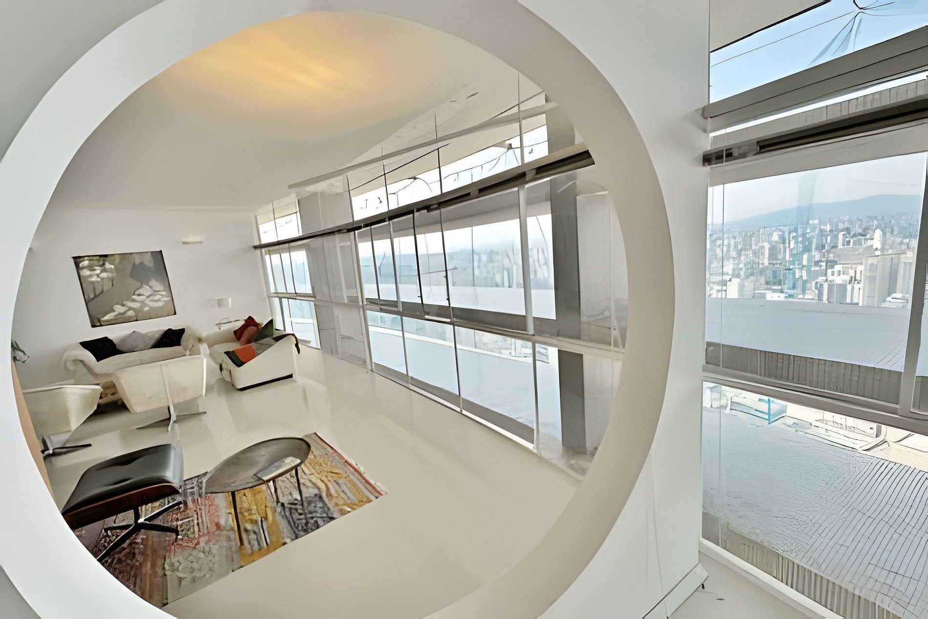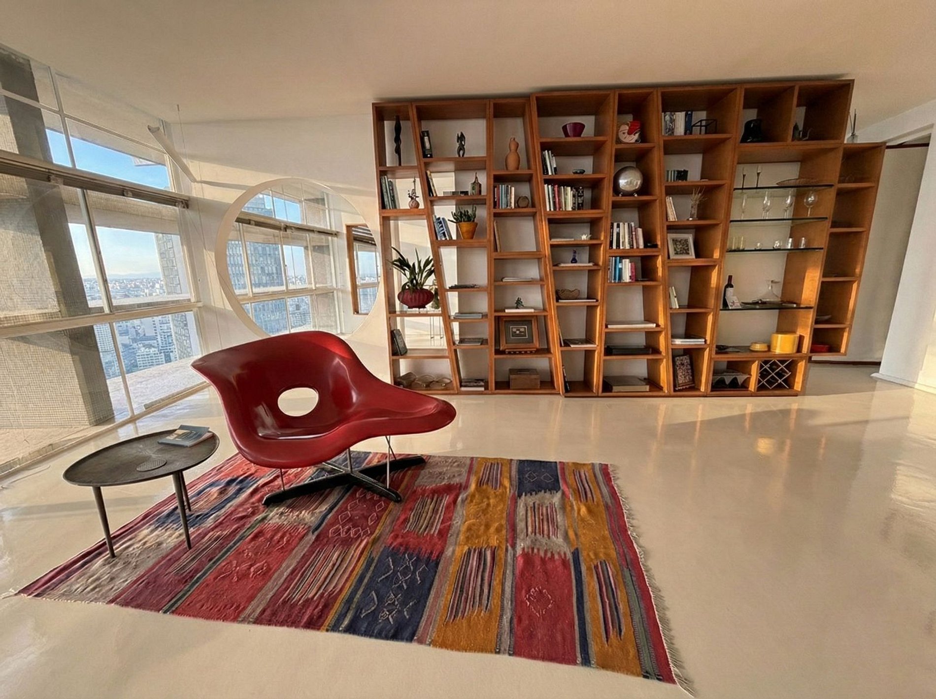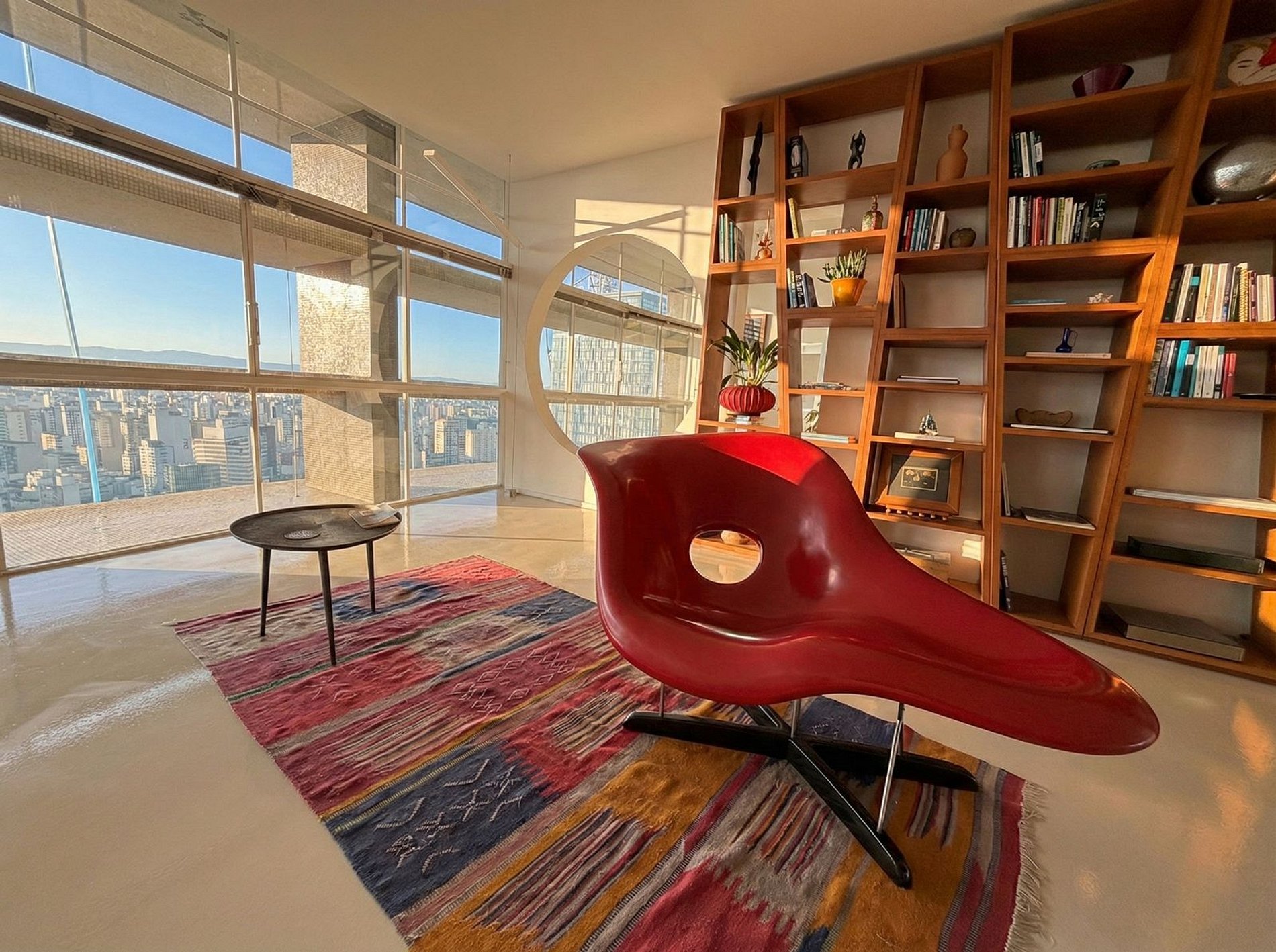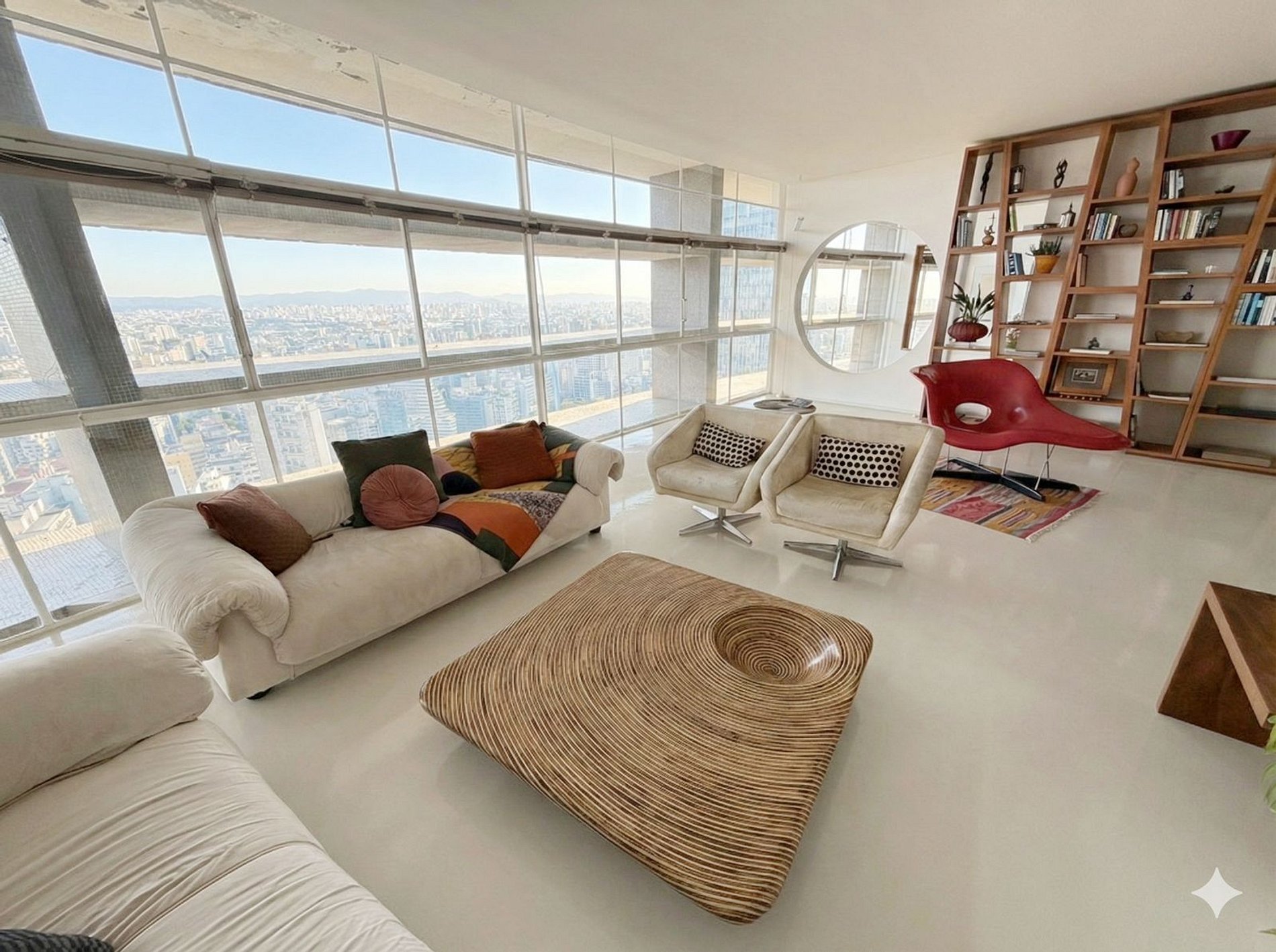 Este projeto do arquiteto alemão Walter Faigle, aluno da lendária Ulm Design School na década de 50, e que foi amigo pessoal dos proprietários, traduz para o ambiente do Copan elementos de sua genialidade. O apartamento, que está no último andar do edifício, traz o piso em revestimento monolítico branco, prolongando o horizonte da cidade para dentro de seus 180 m2. A maior planta do Edifício Copan, que foi redesenhada para dois espaçosos dormitórios e uma grande área de convívio.