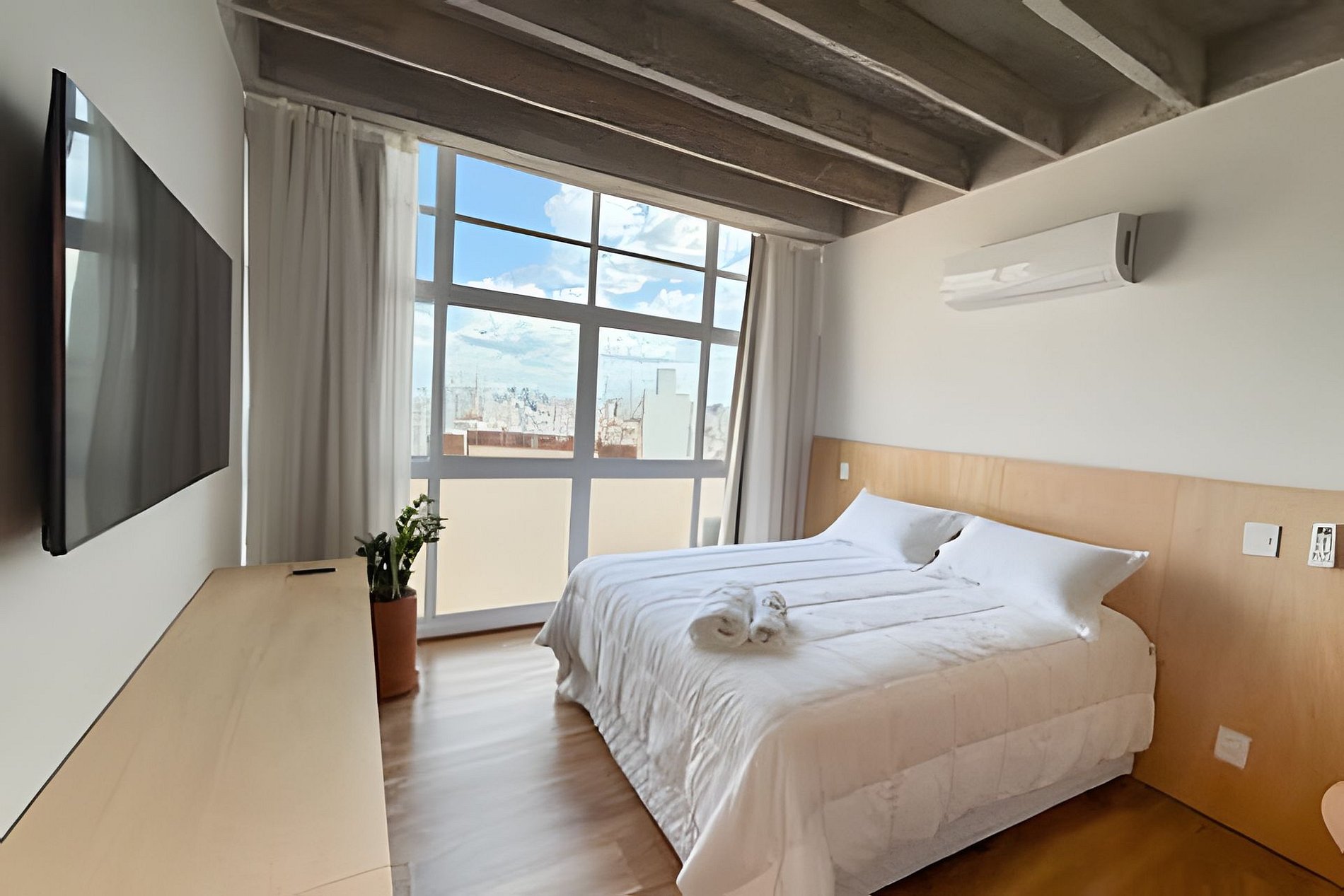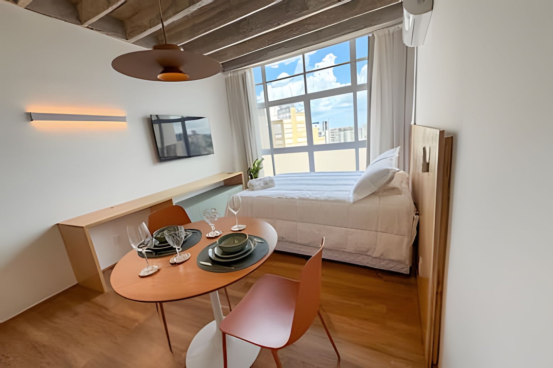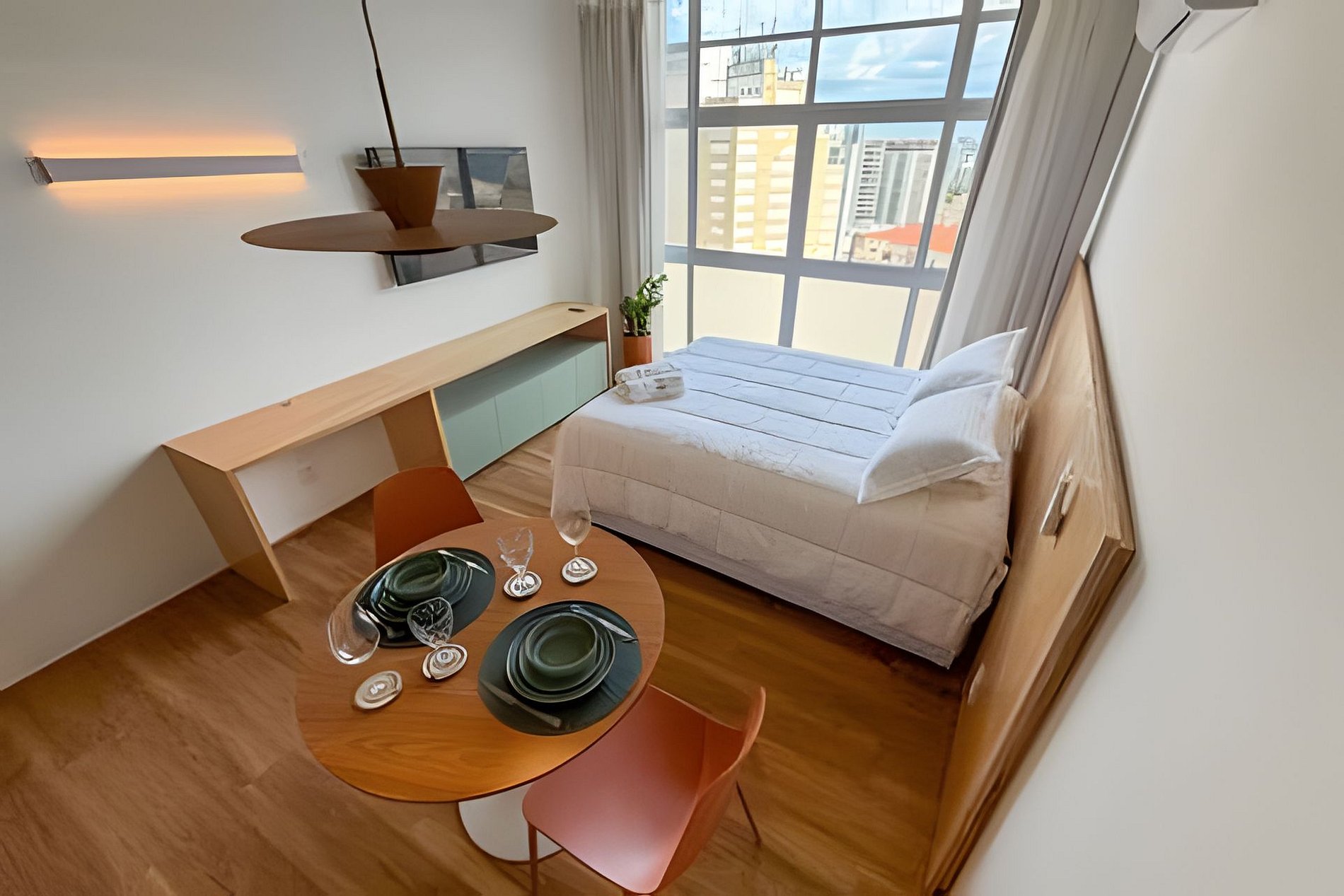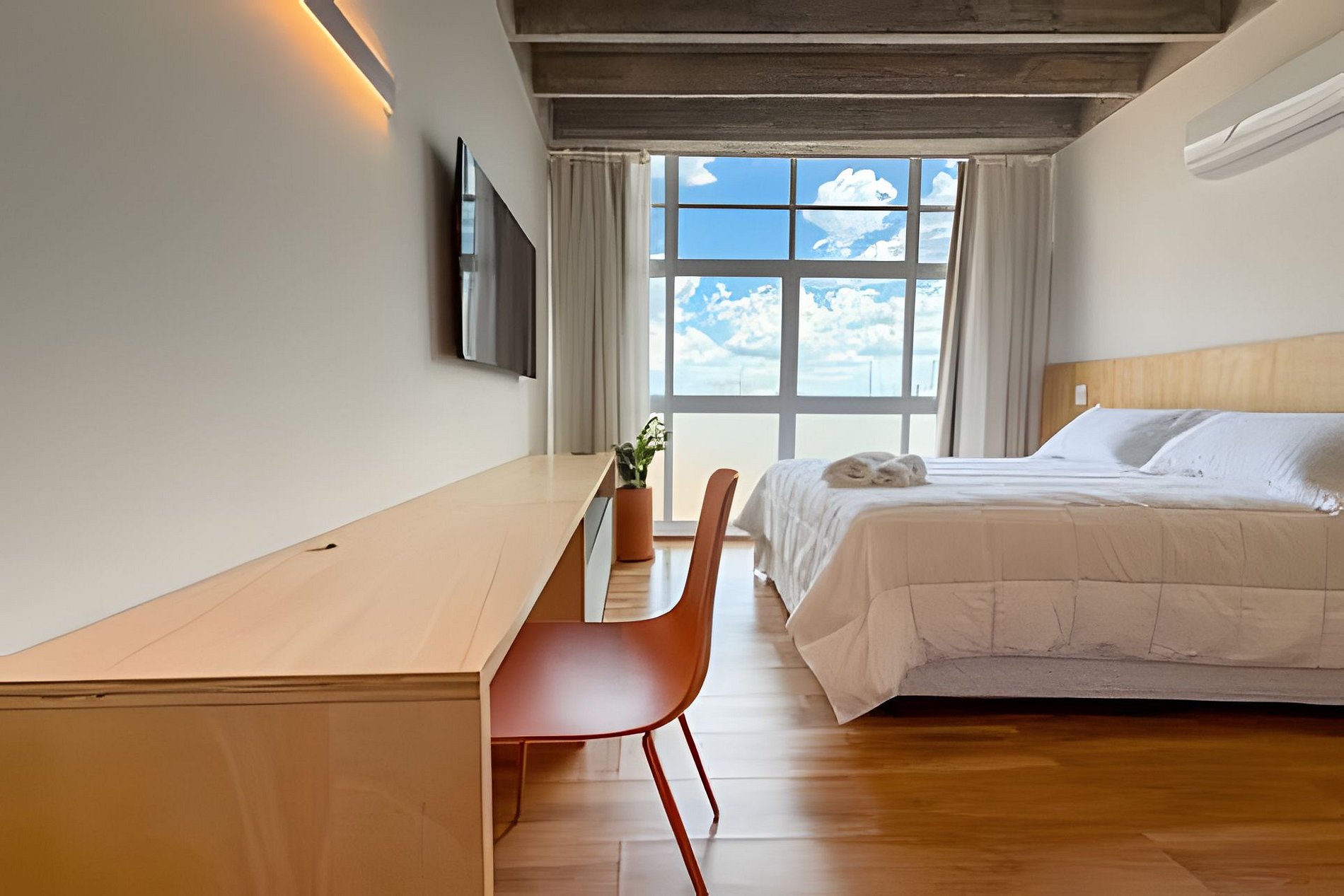 O João de Barro é um refúgio urbano acolhedor e cheio de personalidade. Com design contemporâneo, tons terrosos e madeira aparente, o espaço transmite conforto e calma no coração da cidade. A ampla janela garante ótima iluminação natural e vista aberta. O apê conta com cama confortável, ar-condicionado, mesa para refeições, banheiro moderno e armário funcional. Ideal para quem busca praticidade, estilo e uma estadia aconchegante em São Paulo.