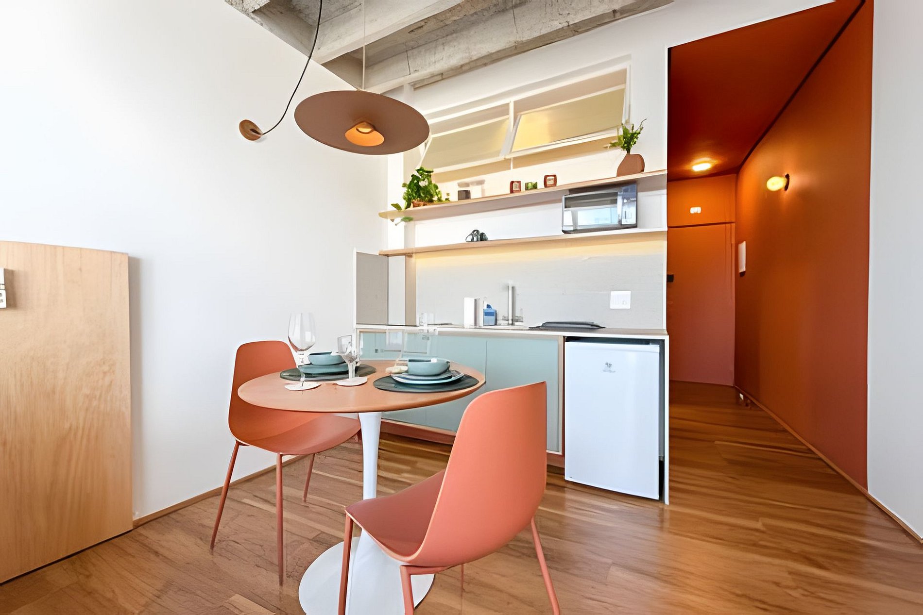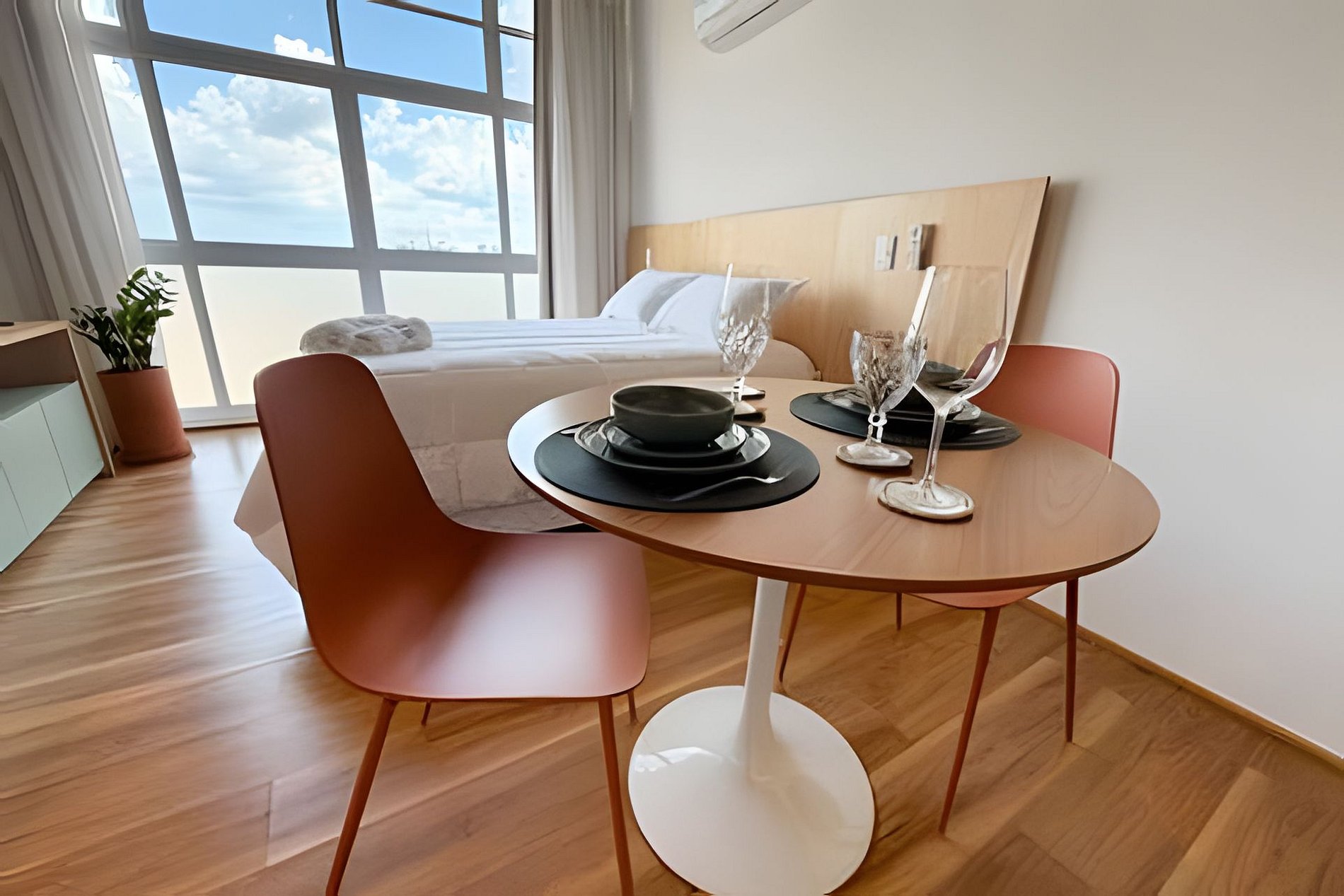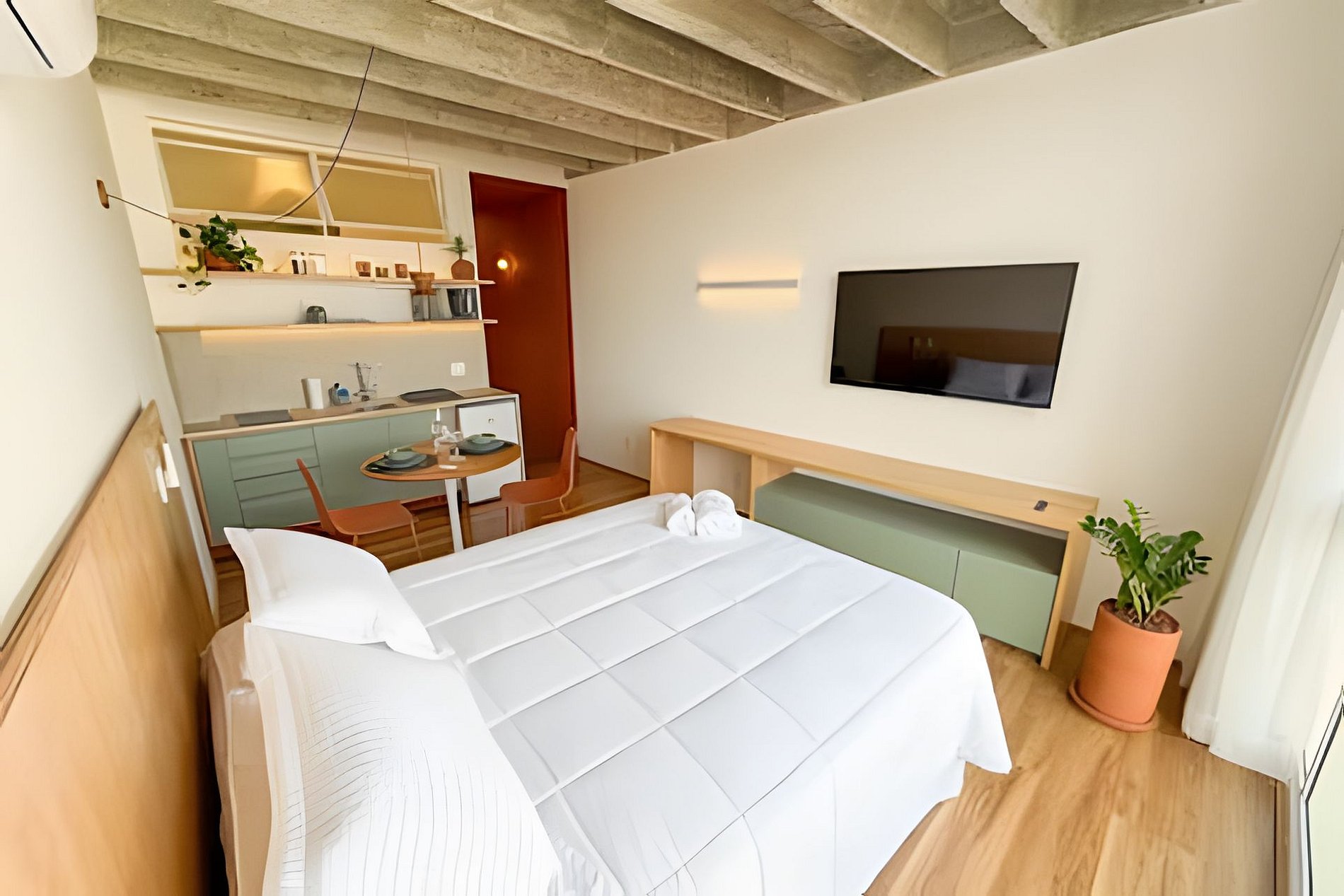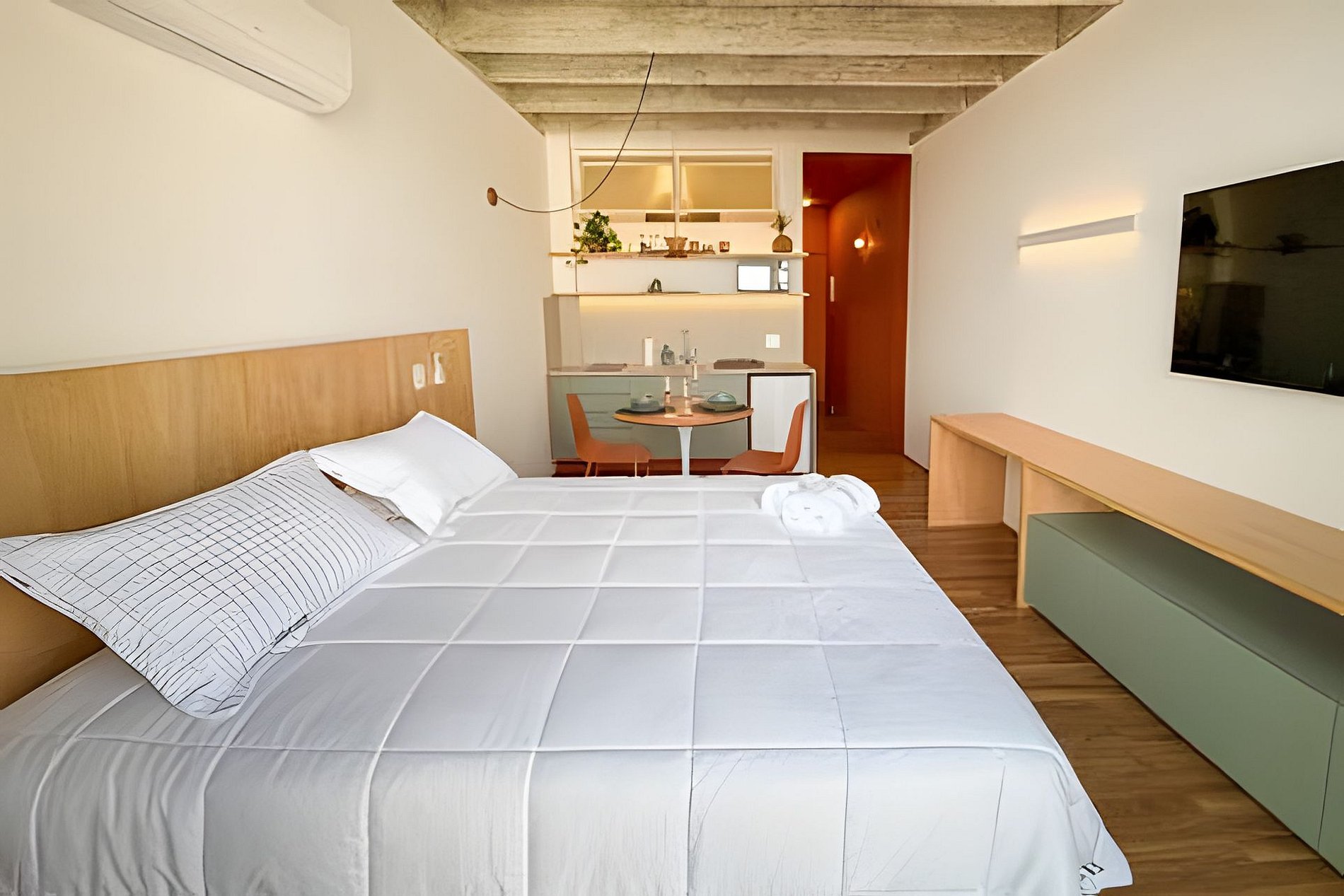 O João de Barro é um refúgio urbano acolhedor e cheio de personalidade. Com design contemporâneo, tons terrosos e madeira aparente, o espaço transmite conforto e calma no coração da cidade. A ampla janela garante ótima iluminação natural e vista aberta. O apê conta com cama confortável, ar-condicionado, mesa para refeições, banheiro moderno e armário funcional. Ideal para quem busca praticidade, estilo e uma estadia aconchegante em São Paulo.