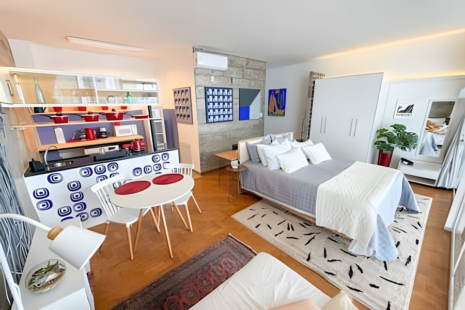 Studio moderno e acolhedor. O espaço integra quarto, sala e cozinha com design contemporâneo, iluminação natural abundante e decoração elegante. Conta com cama confortável, área de trabalho, cozinha equipada e telão para filmes, ideal para relaxar após um dia na cidade. Perfeito para casais ou viajantes a trabalho que buscam praticidade, conforto e uma experiência única em localização privilegiada. Ar condicionado.