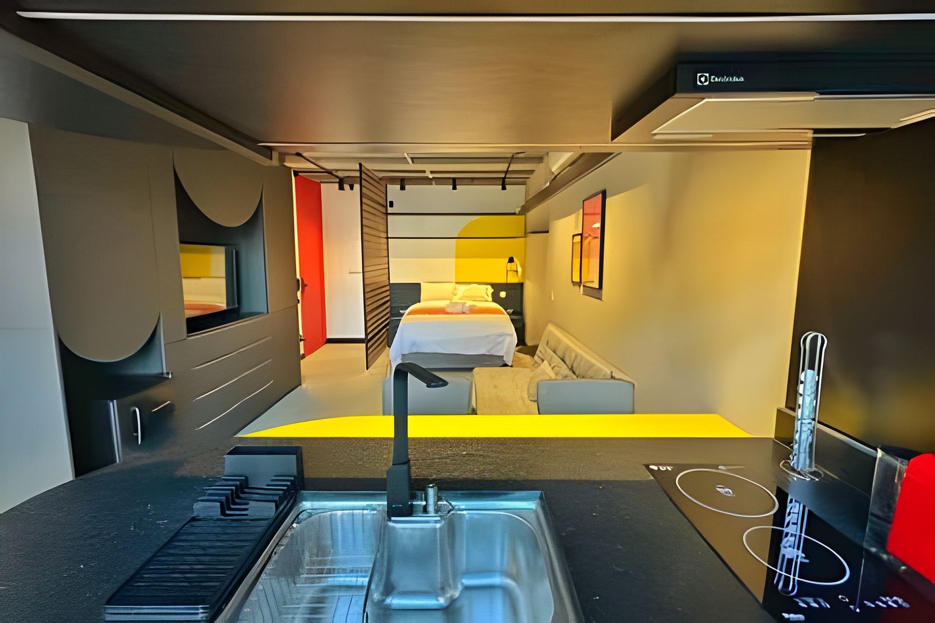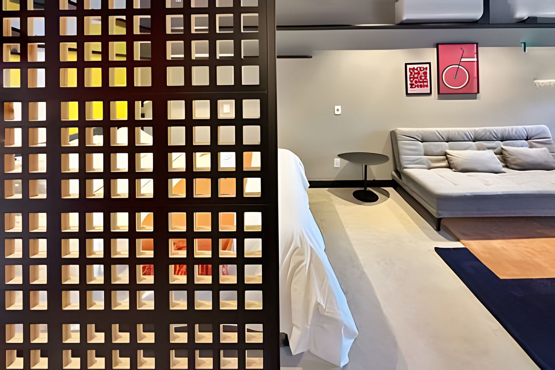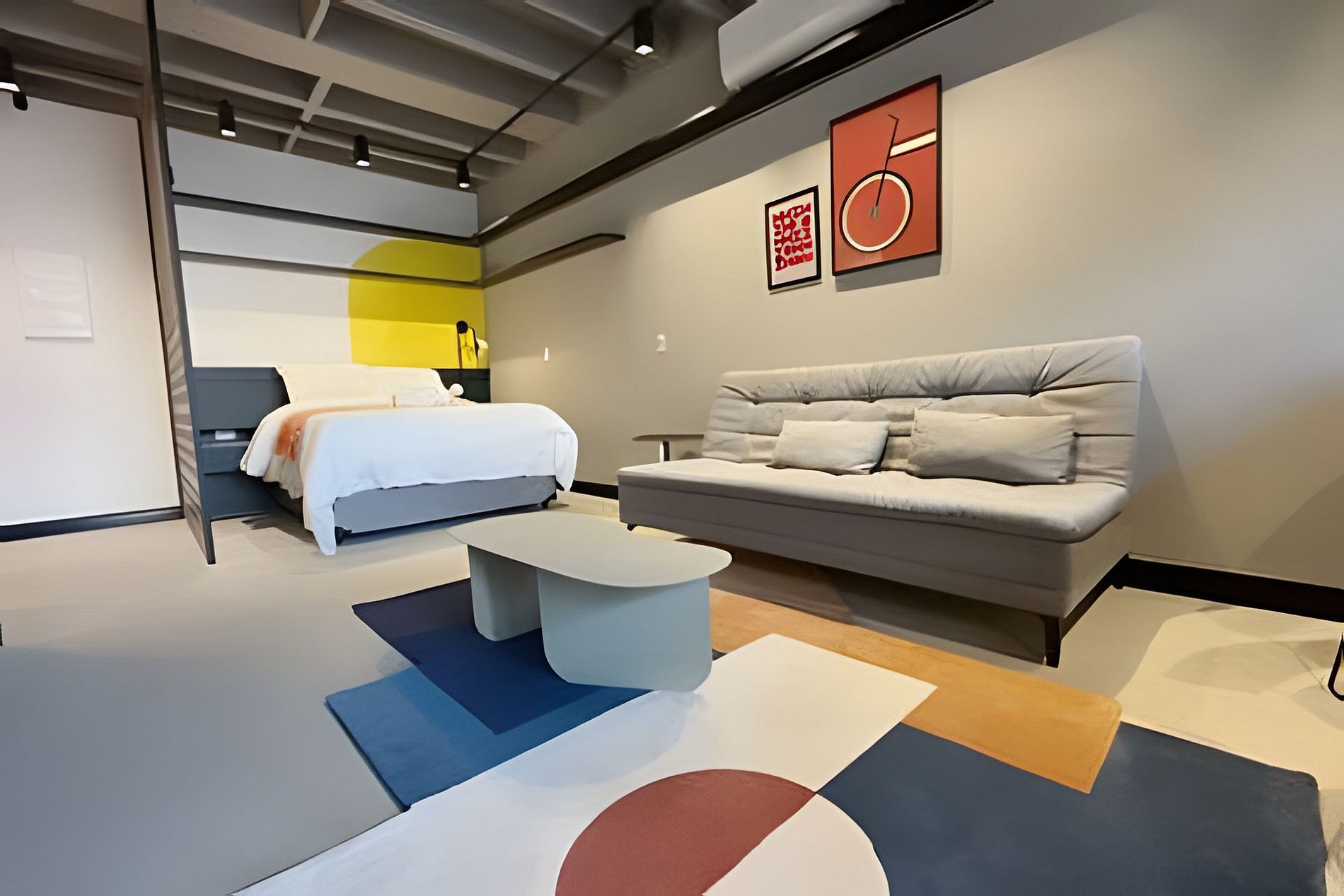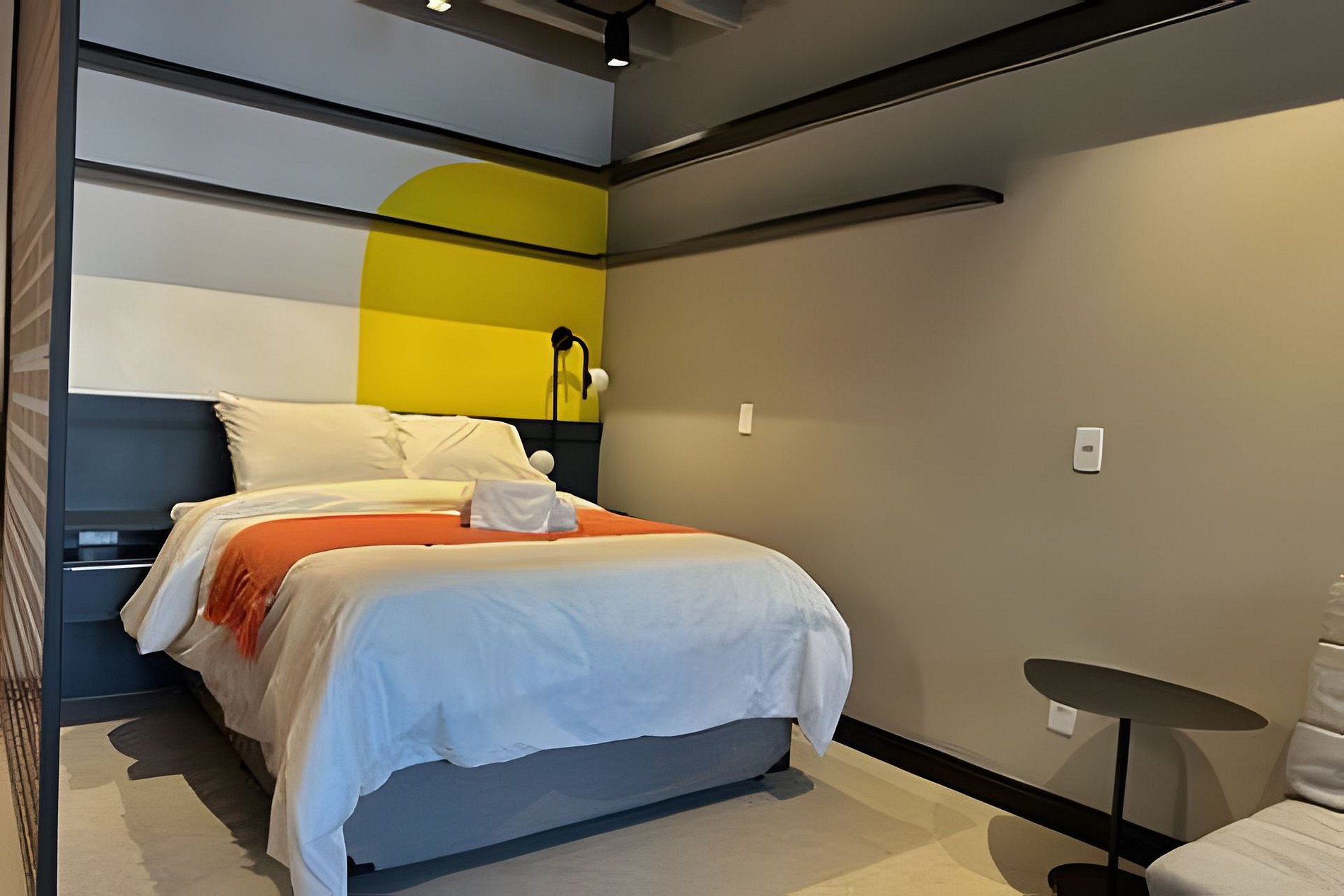 "Entre Curvas e Cores" é uma celebração da arquitetura modernista brasileira, onde a sensualidade se encontra com a funcionalidade. Inspirada na obra de Lúcio Costa e na estética do Edifício Copan, esta suíte convida os hóspedes a explorar um espaço que é tanto um refúgio quanto uma experiência sensorial. Lúcio Costa foi o que trouxe uma releitura do Bauhaus na arquitetura com formas e cores, trouxemos o BauHaus com essa temática mas dar vida a suíte.